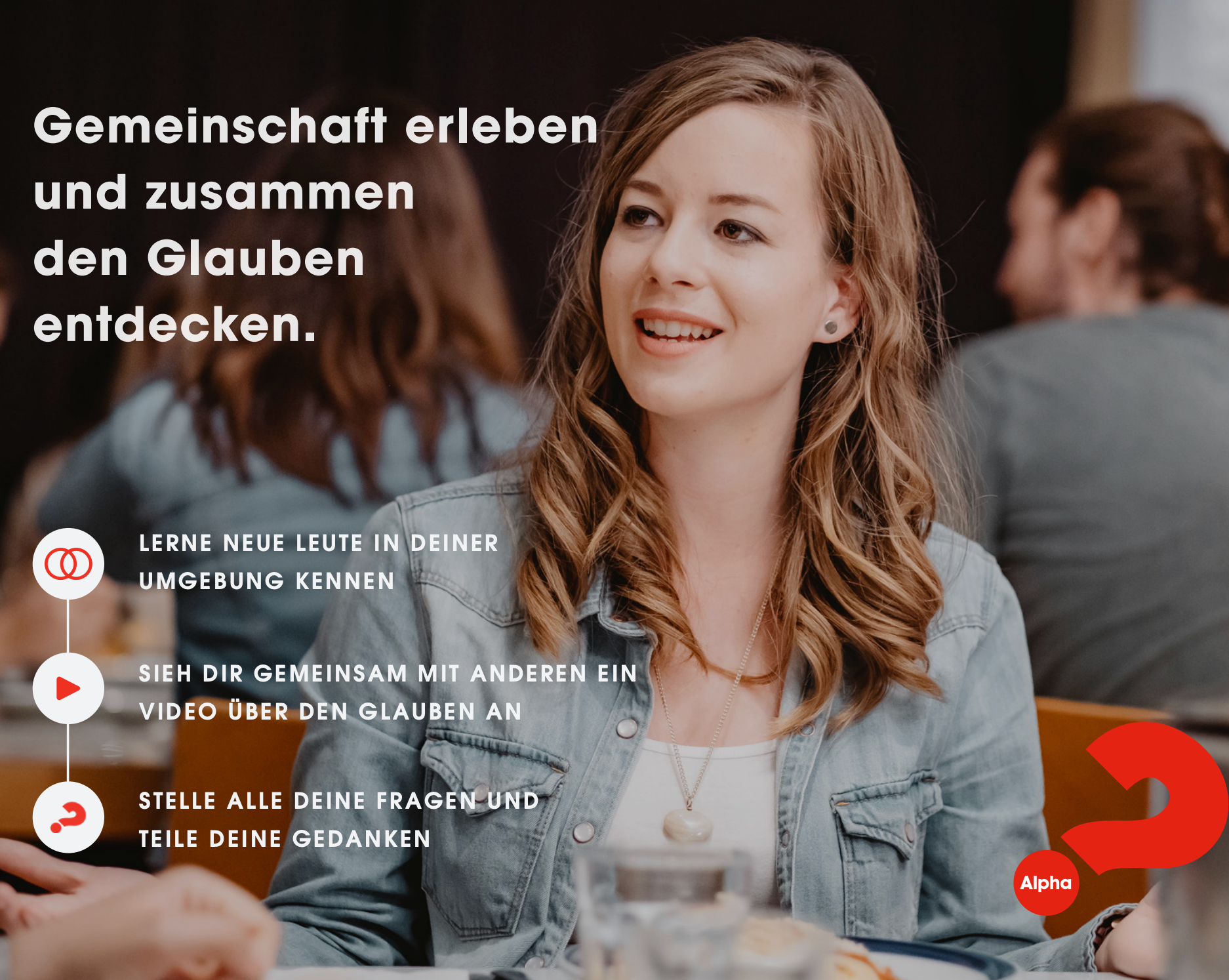 Beim Alpha-Glaubensgrundkurs kommen Menschen zusammen, um neue Leute kennenzulernen, gemeinsam ein kurzes Video über den christlichen Glauben anzuschauen, Fragen zu stellen, Gedanken auszutauschen und Gemeinschaft zu erleben. Auch gemeinsames Essen gehört dazu und schafft Raum für Begegnung und Gespräche auf Augenhöhe. Vorkenntnisse sind nicht nötig – jede Frage ist willkommen.