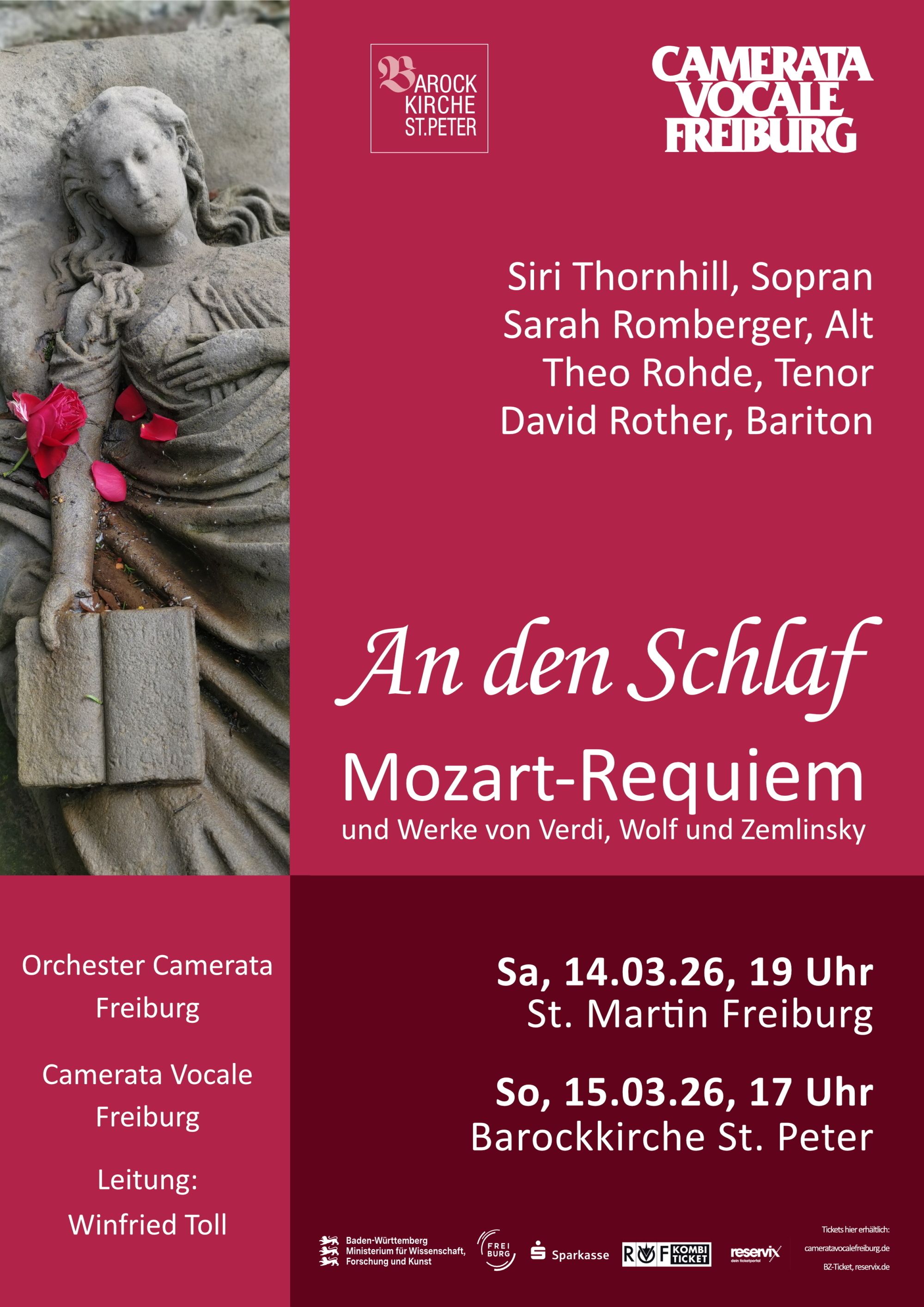 Unter dem Titel »An den Schlaf« präsentieren Winfried Toll und die Camerata Vocale Freiburg ein außergewöhnliches Konzertprogramm, das den Gedanken an Tod und Vergänglichkeit im Requiem in d-Moll von W. A. Mozart aus unterschiedlichen Perspektiven beleuchtet.