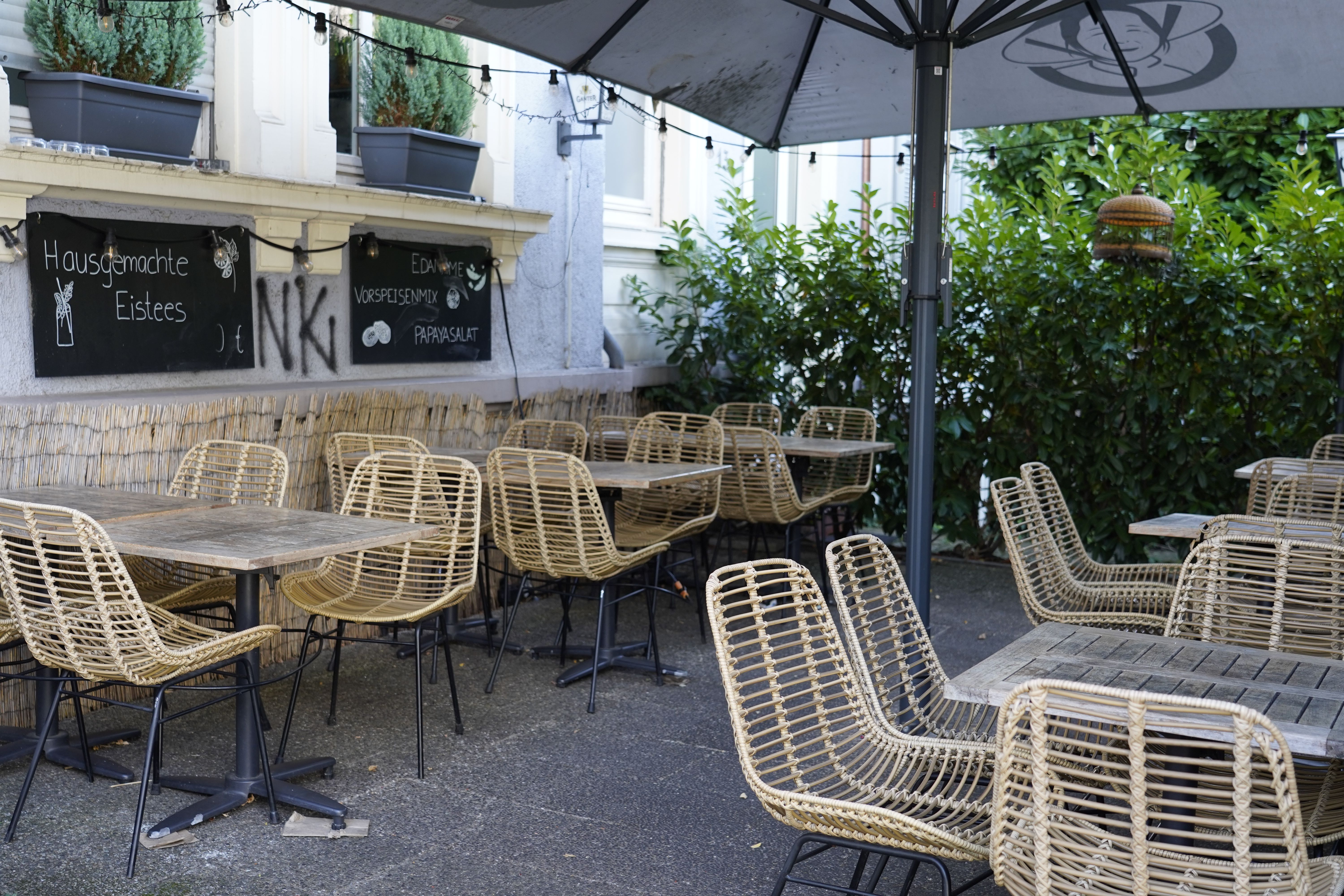 • Schild des Café Extrablatt auf einem Steinkorb, umgeben von Bäumen und einem Glasdach.