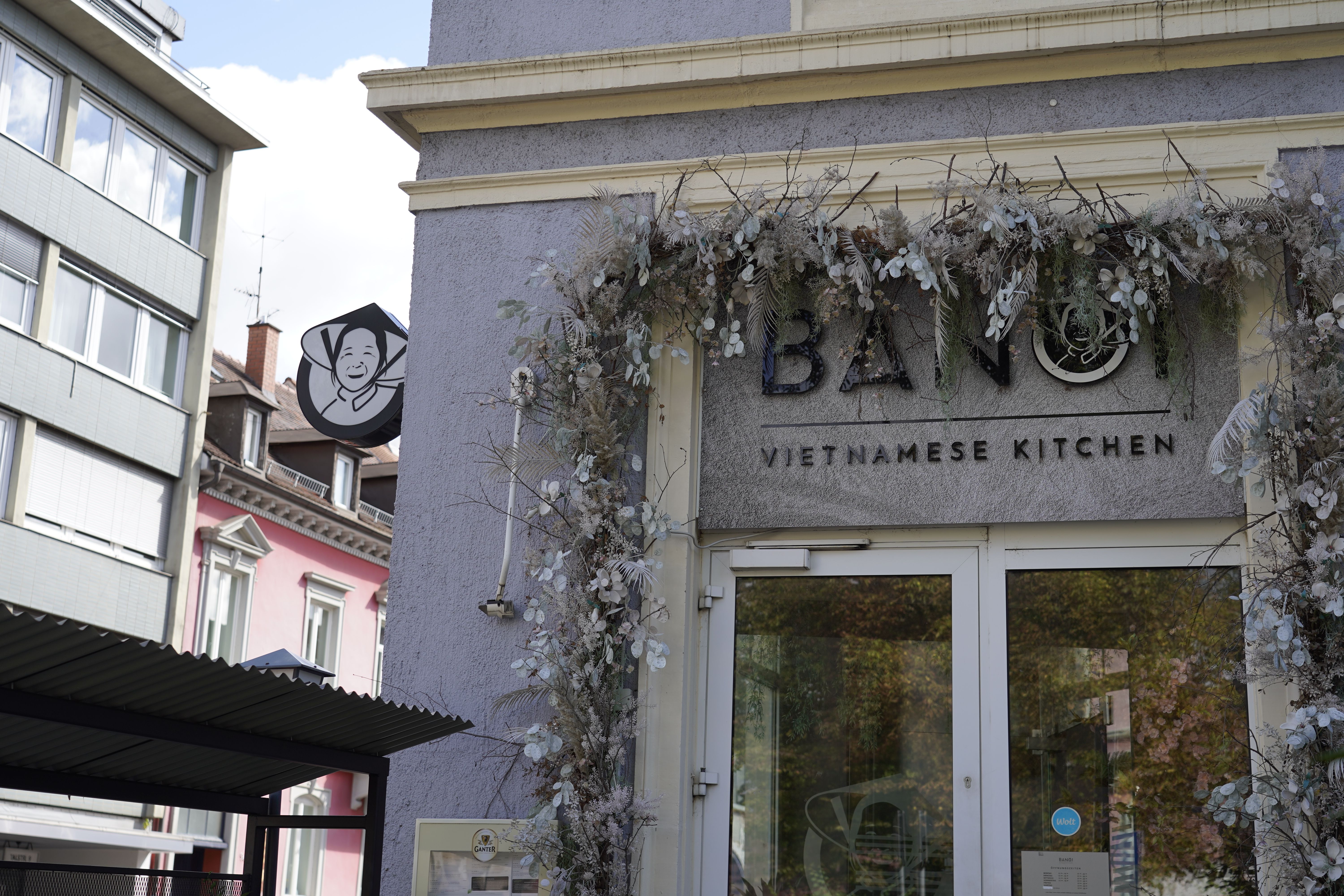• Ein blaues Schild mit der Aufschrift 'El Born' hängt an einer Hauswand in Freiburg. Im Hintergrund sind Balkone und ein Kirchturm sichtbar.