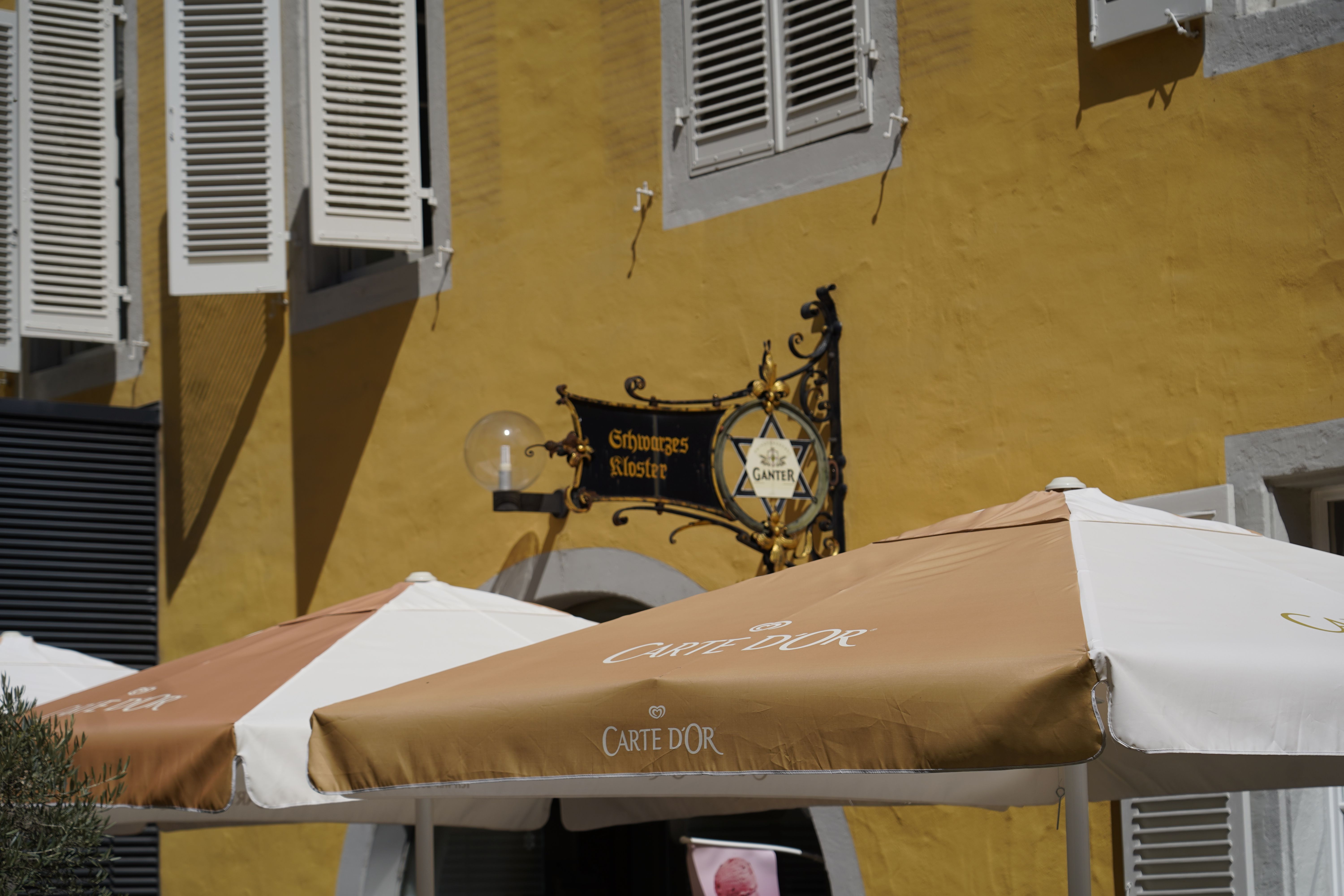 • Außenbereich des Cafés mit weißen Tischen und Stühlen, Blumenbeeten und einem Brunnen. Das Gebäude im Hintergrund hat Balkone und Blumenkästen.