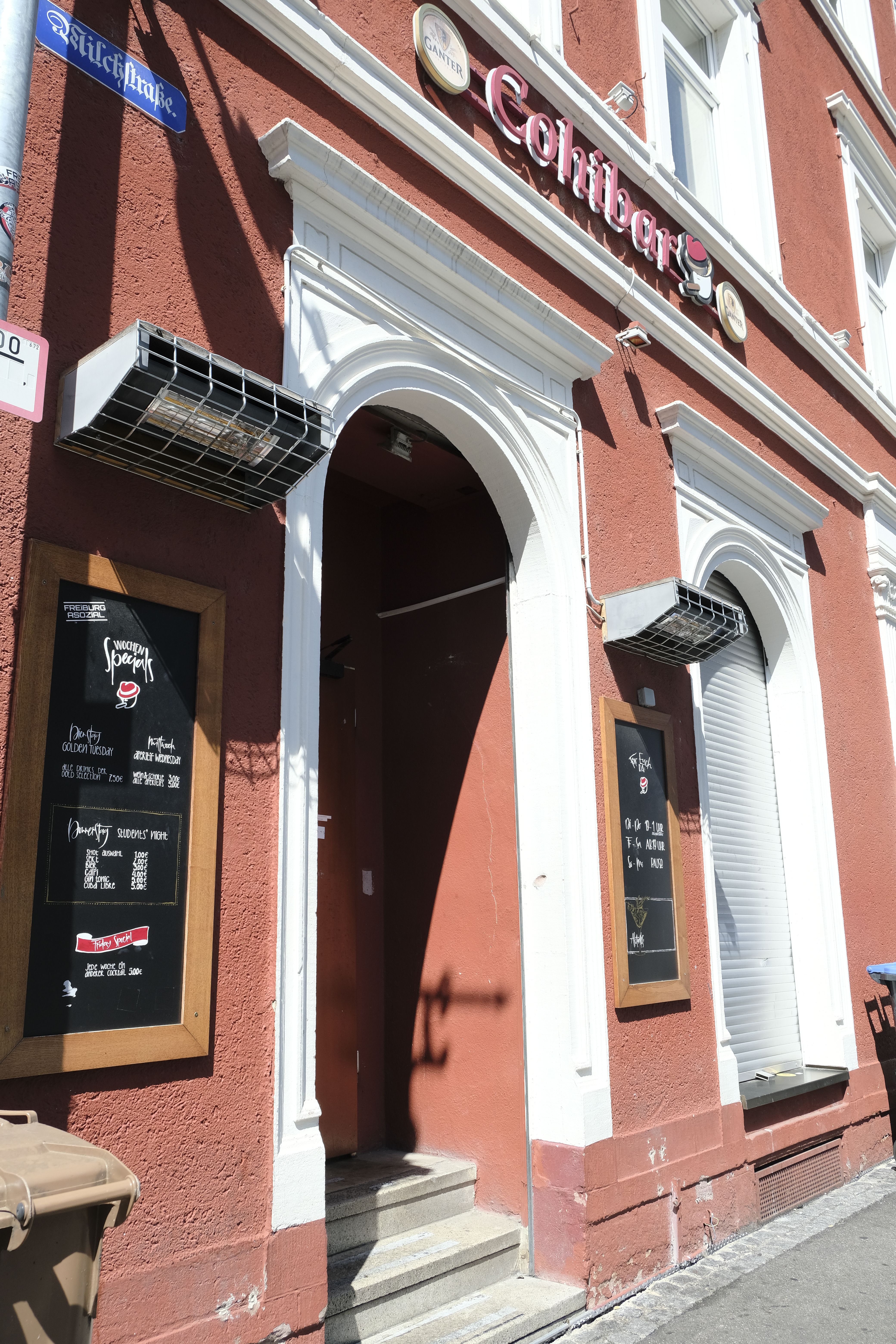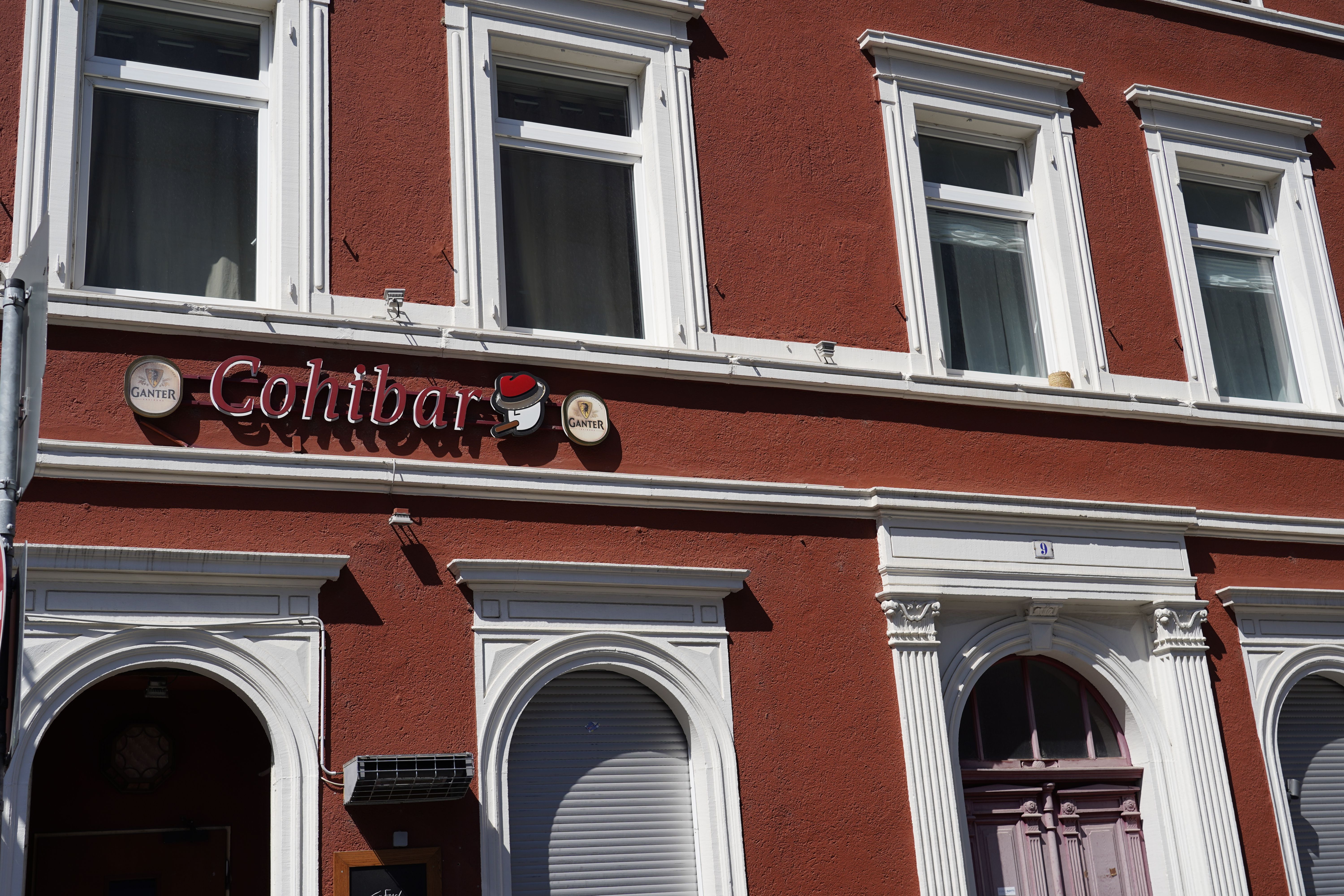 Schild der Cohibar mit stilisiertem Gesicht, Hut und Zigarre an einer Hauswand.