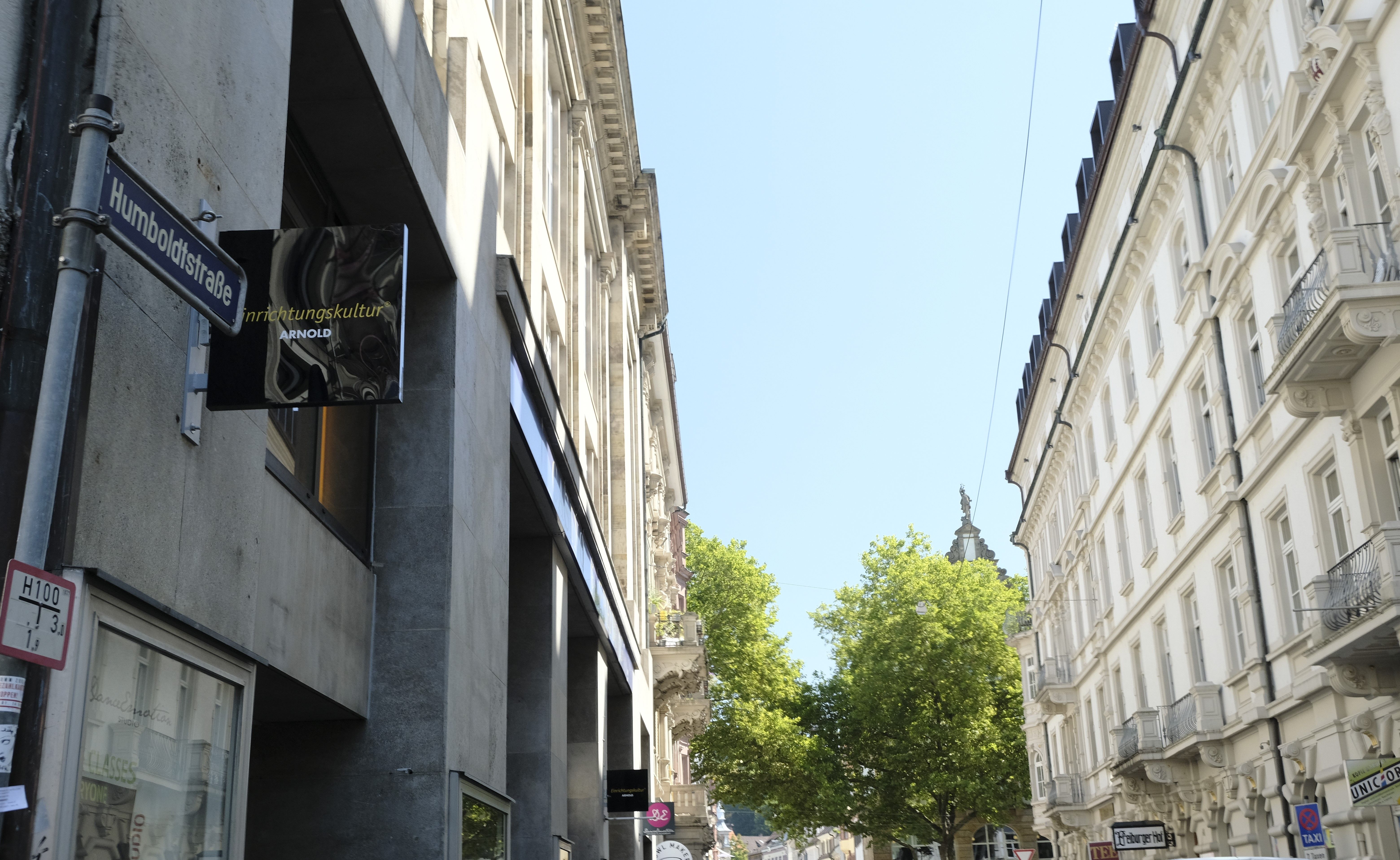 • Fassade eines Teeladens in Freiburg mit Schaufenster und Eingang. Schilder weisen auf Tee, Tassen und Kannen hin. Ein Winterangebot ist auf einer Tafel zu sehen.