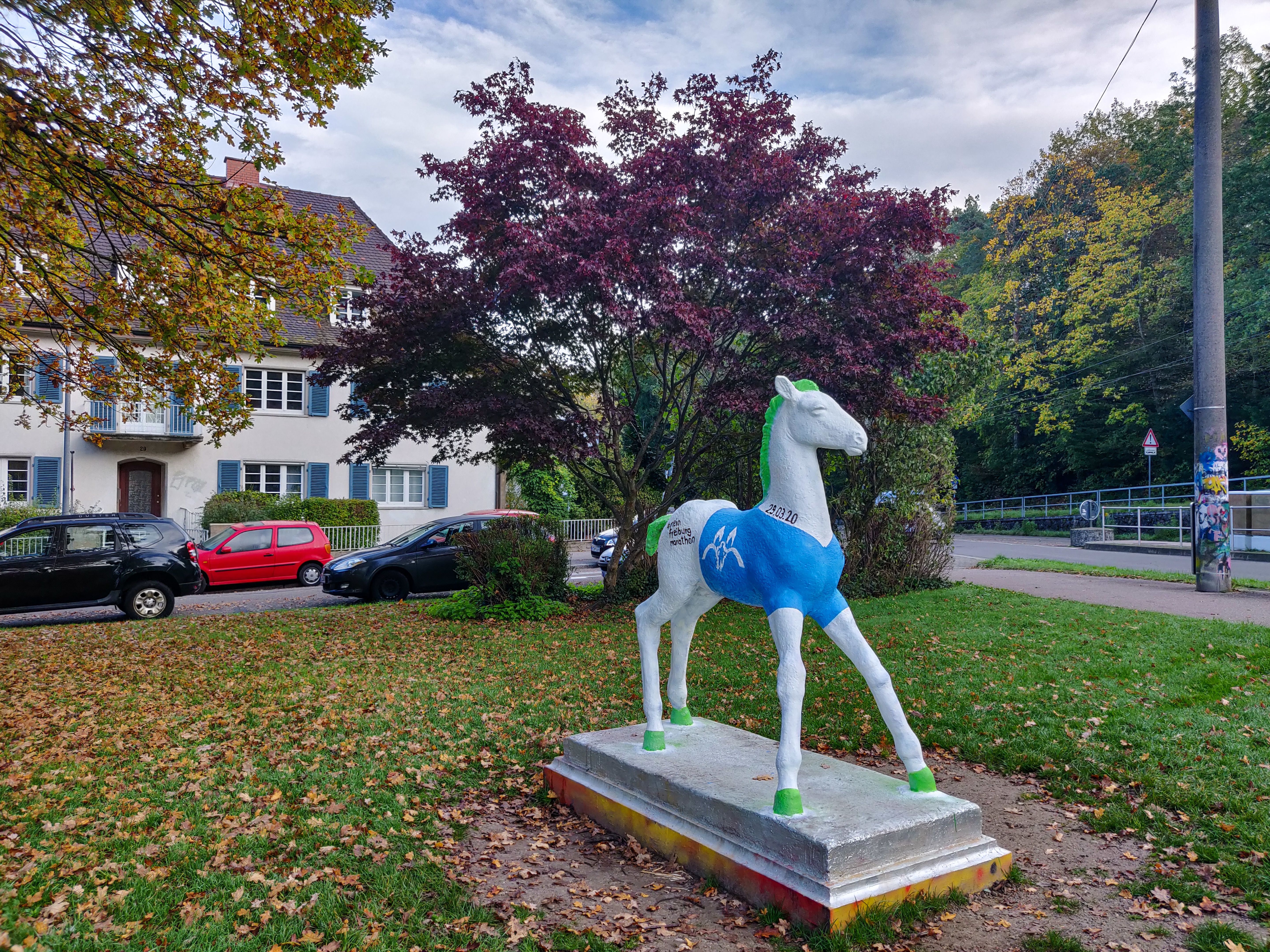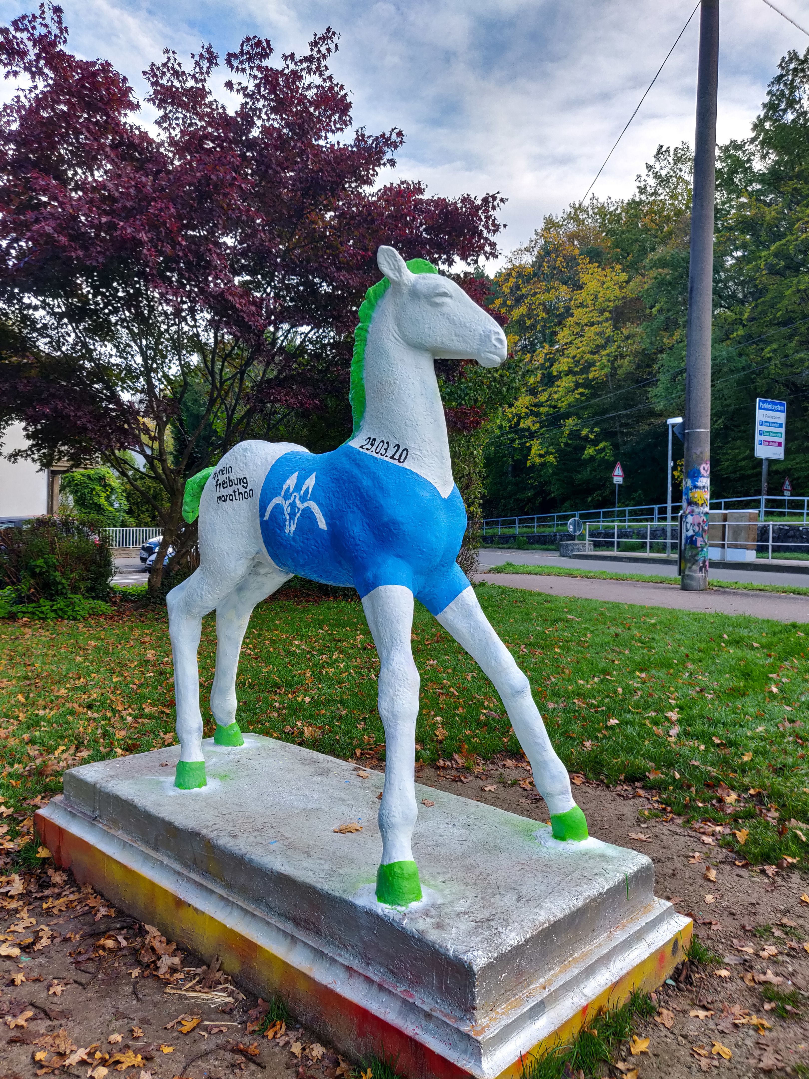 A colorfully painted concrete horse in Freiburg-Wiehre - the Holbein horse is a local art symbol and a constant target of creative transformations at night.