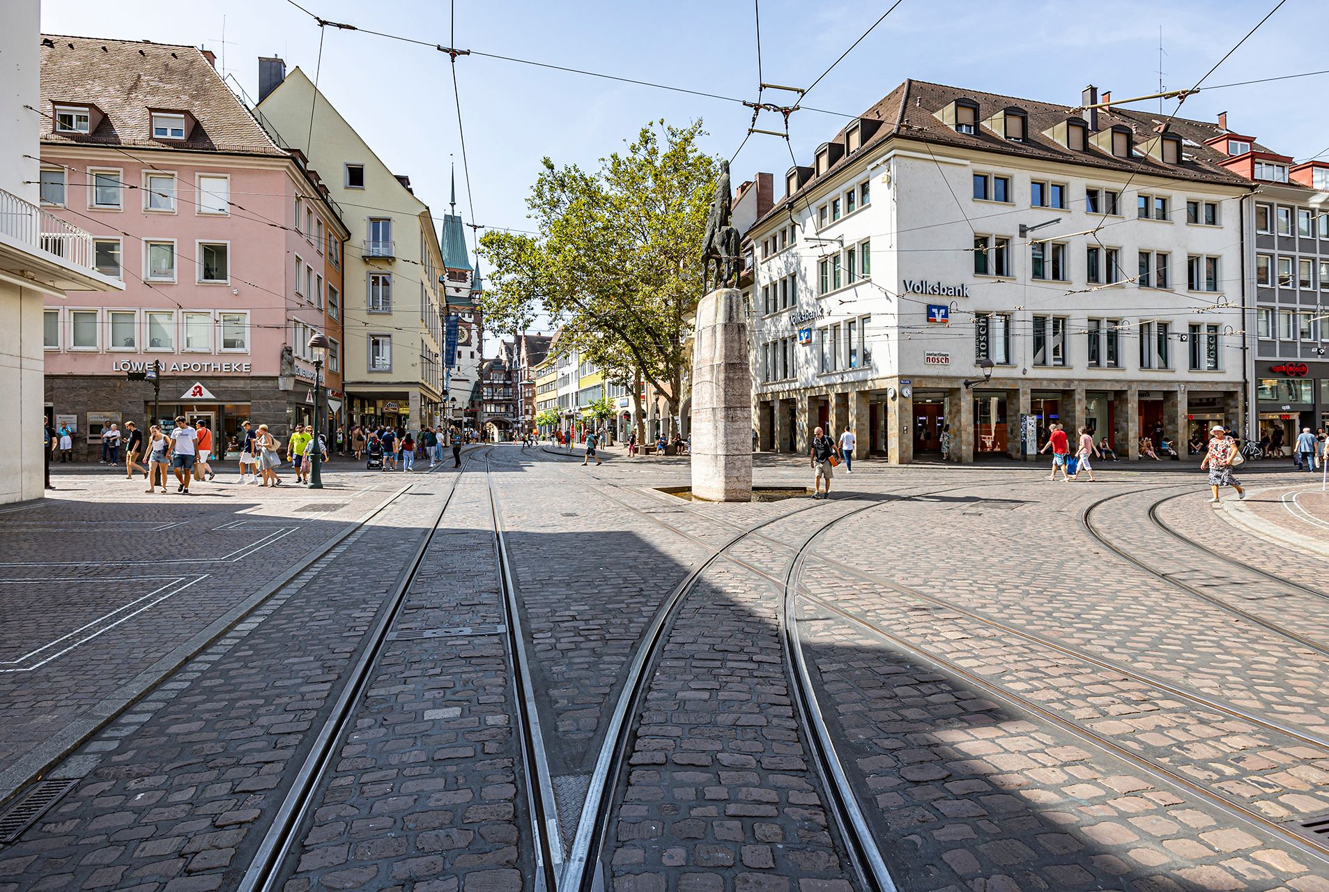 Anyone who manages to cross the street between streetcars, visitors and Freiburg residents will find a limestone plinth around four meters high, crowned with an abstract bronze equestrian statue. The monument, dedicated to the Dukes of Zähringen and named after the city's founder, Duke Bertold, stands in a narrow, shallow pool of water. It was inaugurated in 1965 and replaces the fish fountain that was destroyed during the Second World War.