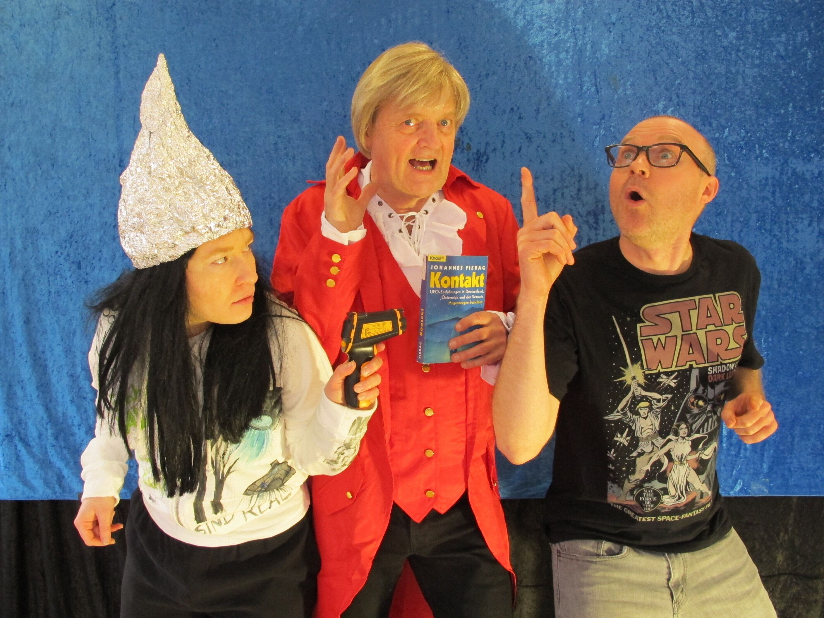 They attend the conference of the Society of Ufologists, which is led by the two well-known ufologists Georg Adam and Yvonne Kirschner. Adam reports on his telepathic contact with extraterrestrials who are considering landing on Earth to save humanity. But Kirschner is certain that alien reptiloids are already here. Disguised as humans, they are trying to enslave the world. Tobias Schröder, one of the guests, is a computer nerd and avid Star Wars fan who is hoping for an encounter with a real alien. Adam performs a ritual with all the guests to invite the aliens to land. But suddenly and surprisingly, one of those present is murdered.