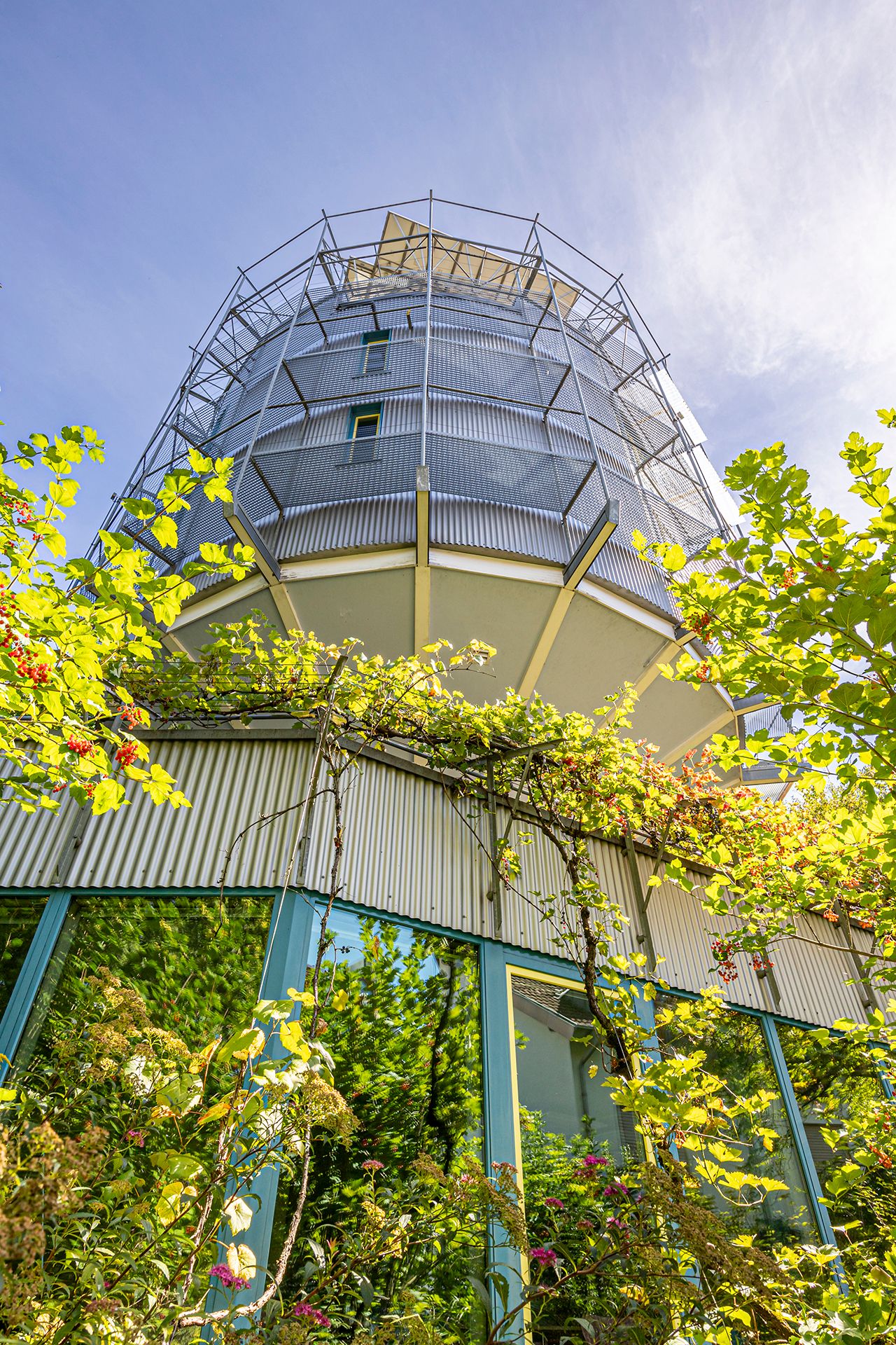The Heliotrope is the world's first plus-energy house and produces three times its energy consumption. It turns with the sun from east to west in order to capture as much sunlight as possible with its glazed side - or to shade itself with its insulated side on hot days. Can be viewed from the outside and guided tours by appointment.
