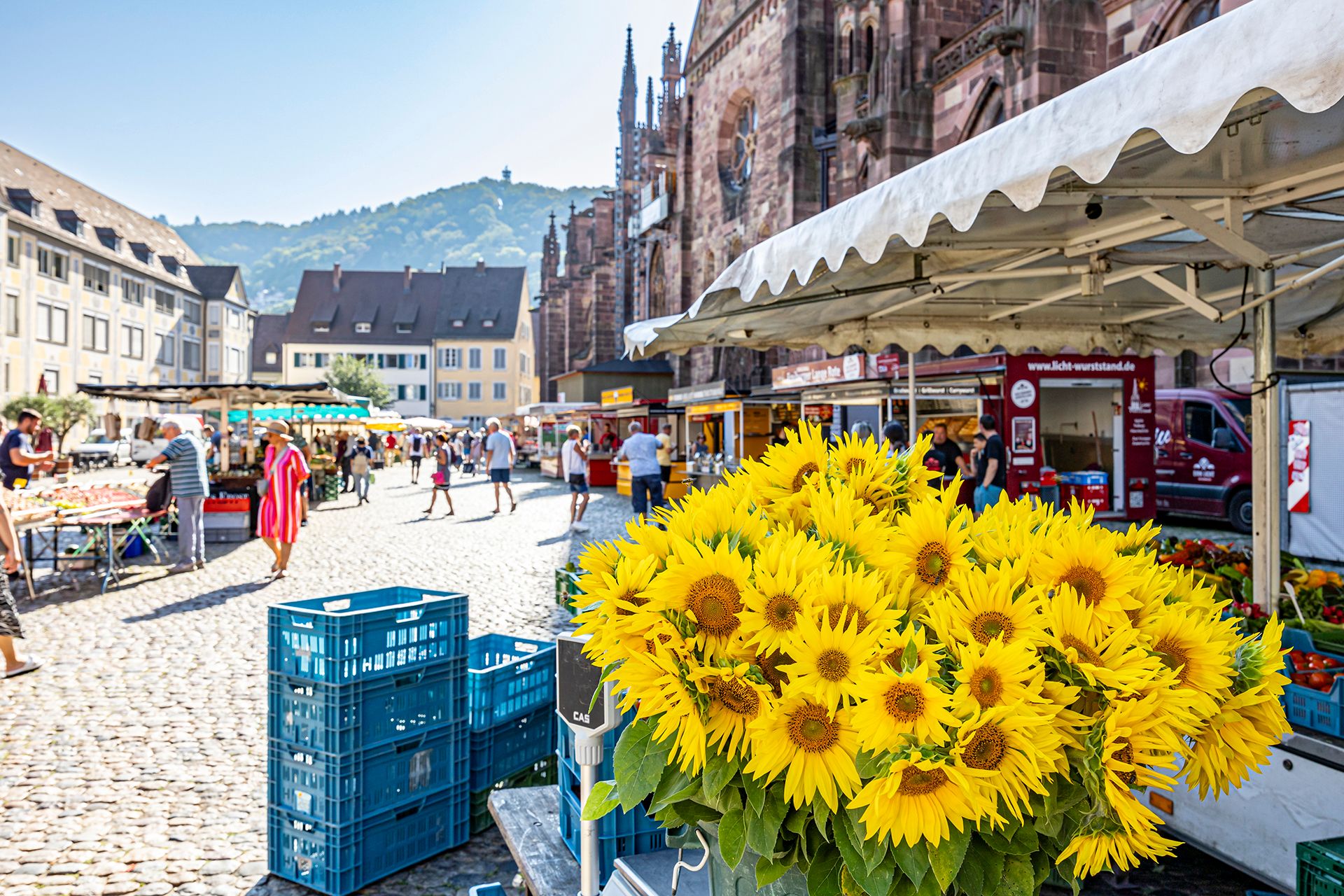 Up to 130 market stalls bring their wares and lots of colorful hustle and bustle to the square around Freiburg Minster from Monday to Saturday.