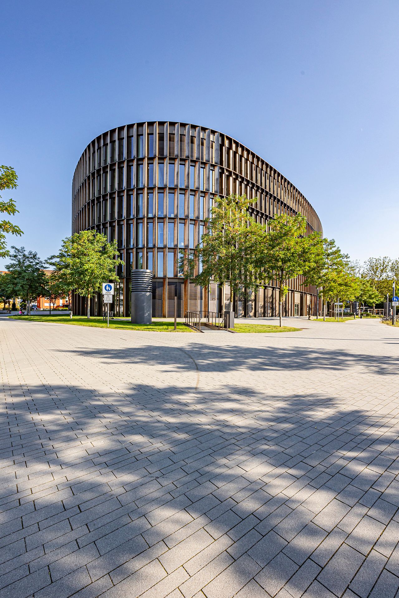 The municipal administration center at Fehrenbachallee 12 is the largest public net-zero energy building in Europe and this is reflected in the architecture: the innovative façade impresses with an alternation of wood, glass and photovoltaic elements and is used to generate energy over the entire area.