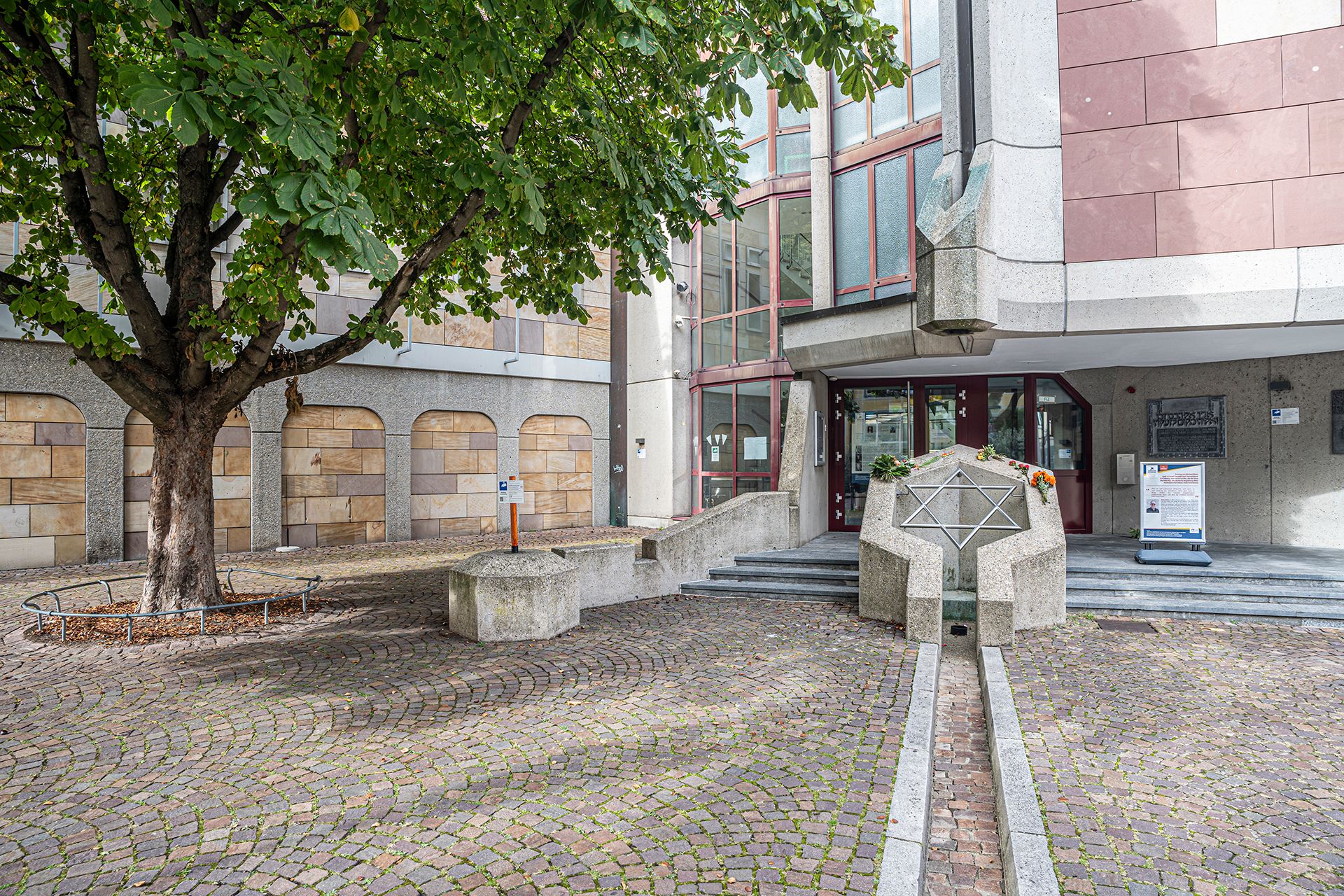 However, it was not realized until 40 years later, when the foundation stone for today's synagogue was laid in 1985. The ceremonial inauguration of the hexagonal postmodern building took place two years later. Valuable carvings from the original synagogue, which were spared from the flames, were integrated into the new building. The square of the old synagogue, opposite the municipal theater and the university library, was redesigned in 2016/2017. The central focus of the square is the synagogue fountain - a memorial and at the same time a lively, new focal point of Freiburg.