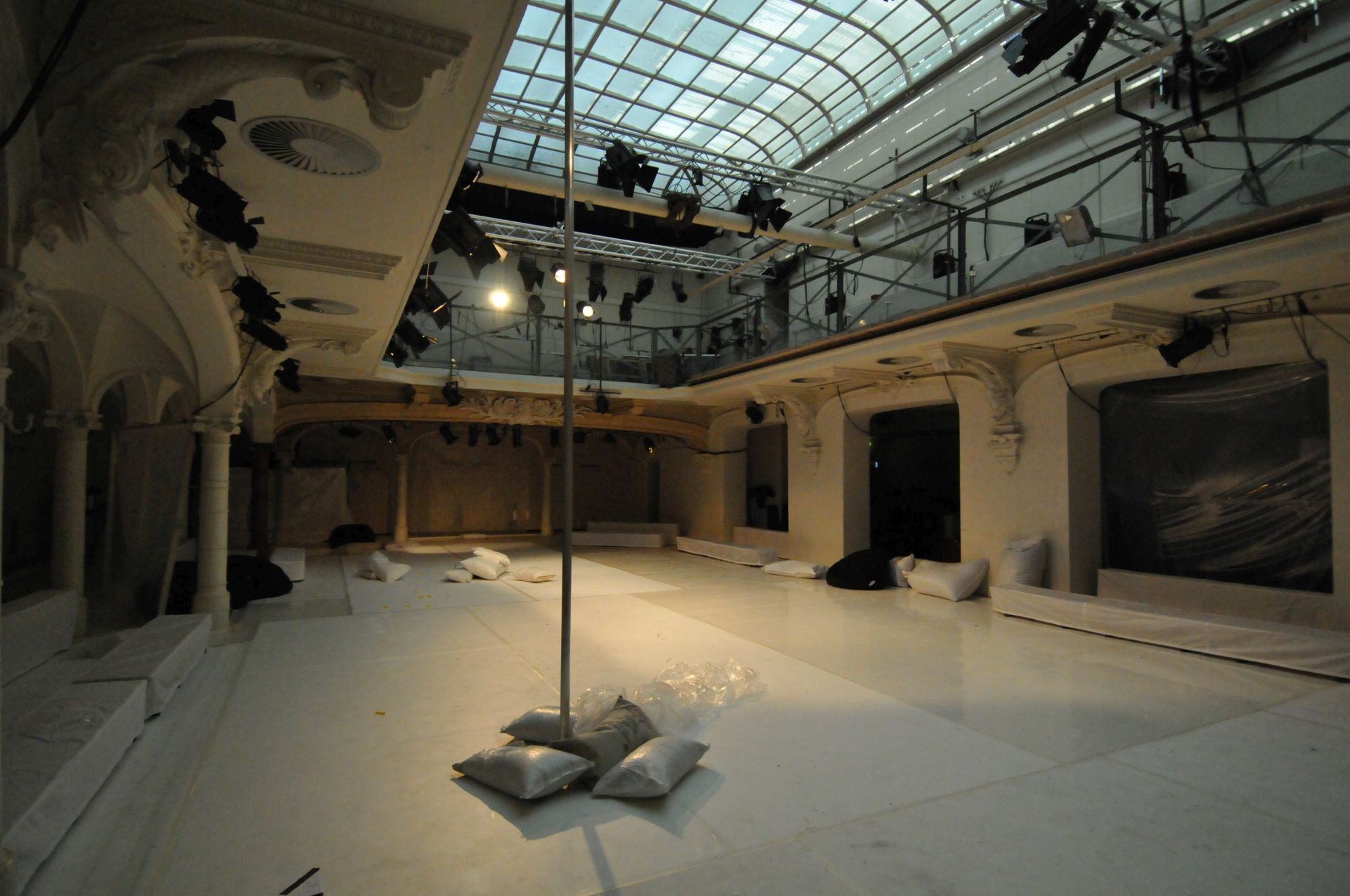 On the outside, the stunning 1902 Art Nouveau-style building looks neither like a typical indoor swimming pool nor a theater, and yet it combines both these functions. The outline of the swimming pool is still visible under the floorboards of the stage. An old spiral staircase on the side leads up to an area which once accommodated individual bathtubs, known as the “Volksbrausebad,” public bathing facilities used by residents whose homes were without plumbing. The stairs now lead to the mezzanine and the lighting Equipment.