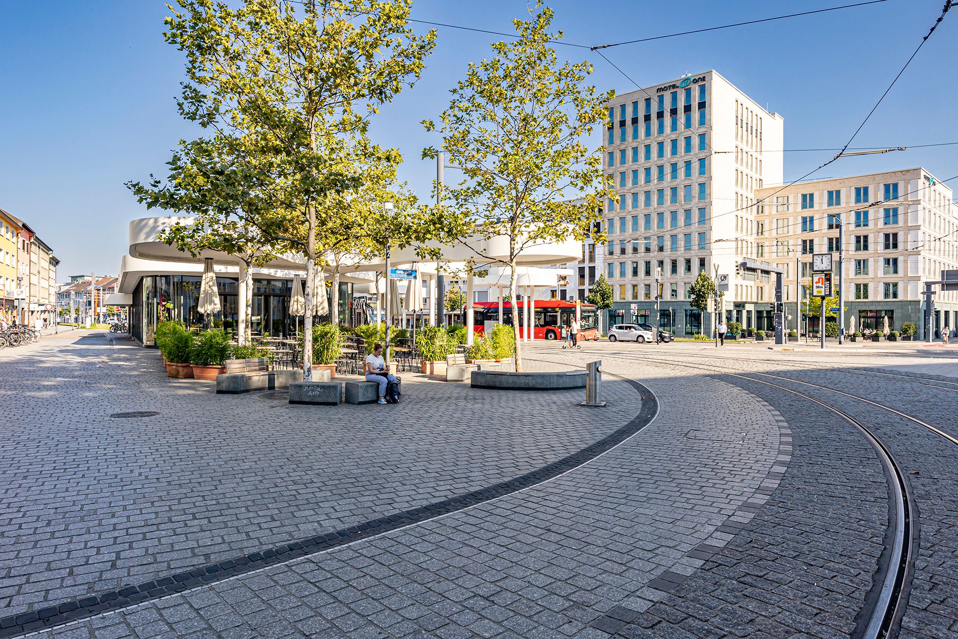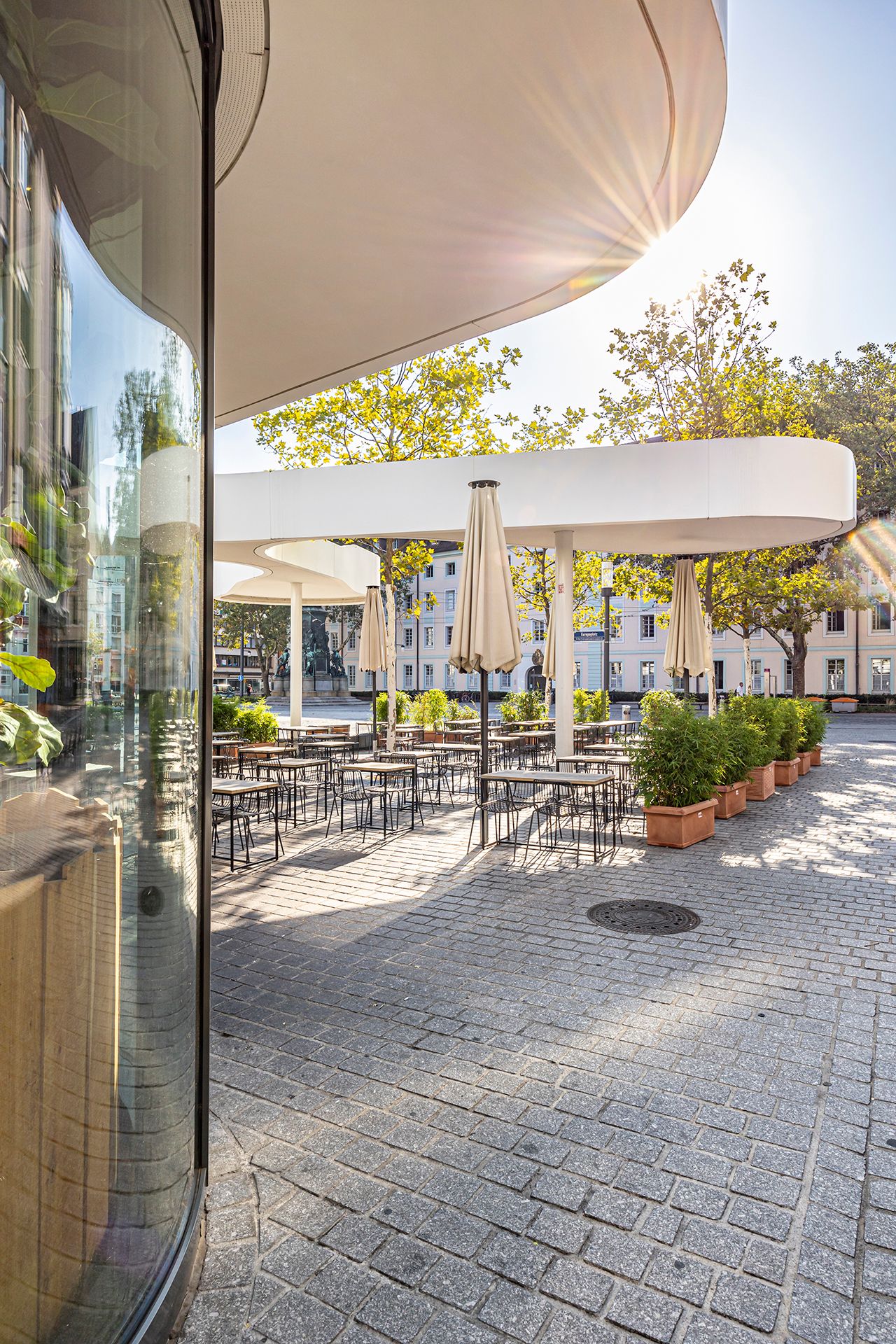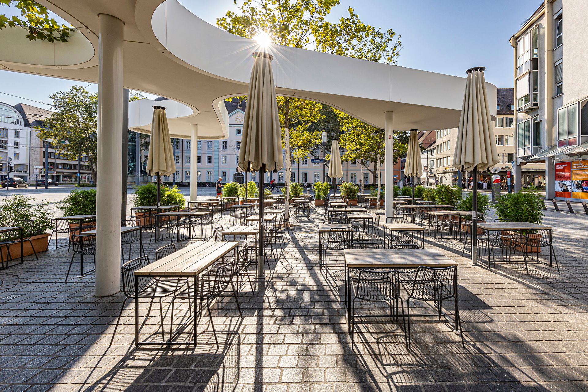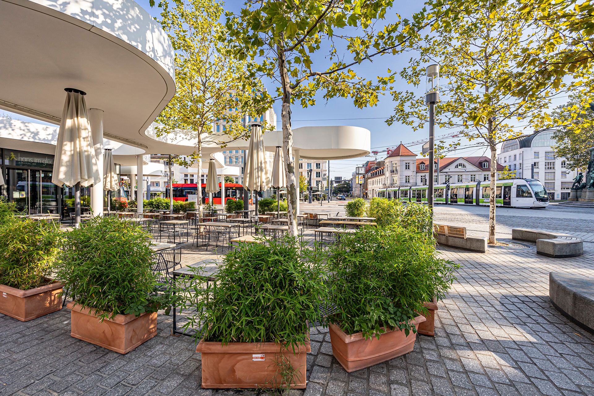 • Blick auf die Terrasse von Hans im Glück am Europaplatz