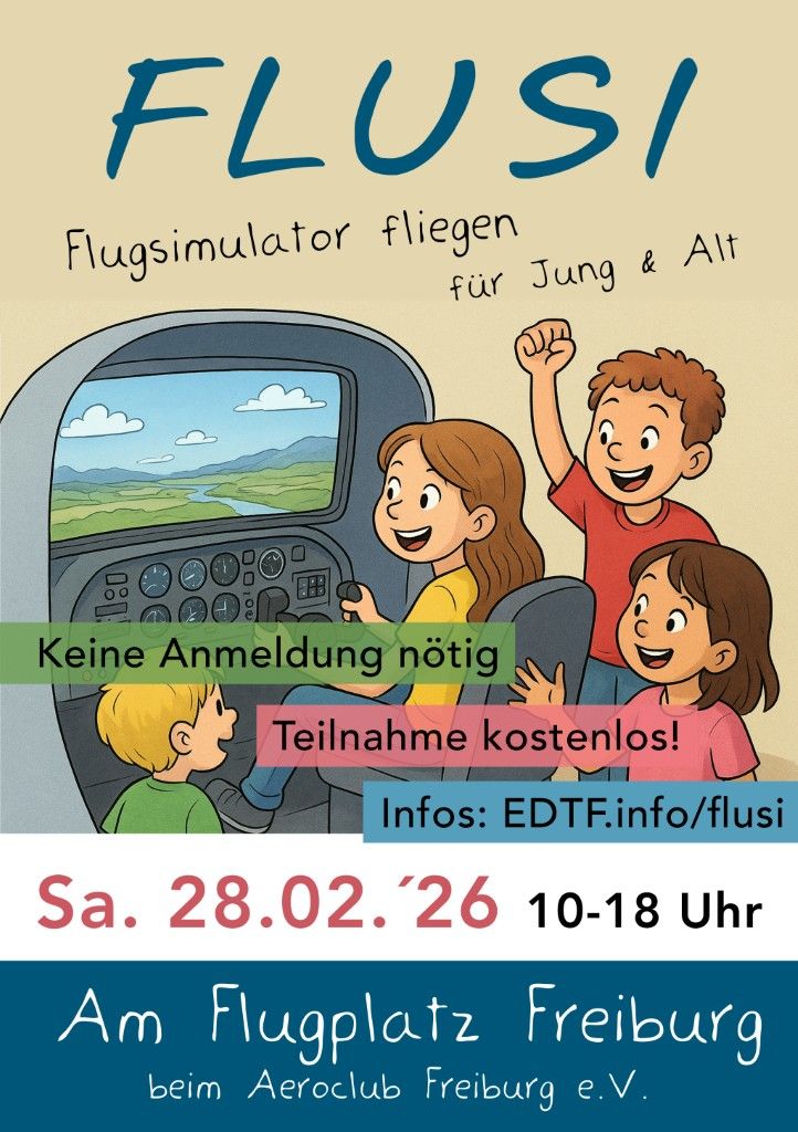 Am 28. Februar 2026 lädt der Aeroclub Freiburg e.V. am Flugplatz Freiburg ab 10 Uhr Groß und Klein zu einem besonderen Erlebnis ein: Am Flugsimulator können Kinder, Jugendliche und Erwachsene selbst ins virtuelle Cockpit steigen und unter Anleitung erfahrener Piloten das Fliegen ausprobieren. Die Teilnahme ist kostenlos – jeder darf einmal Pilot sein. Für die passende Stärkung zwischendurch sorgen Snacks und Getränke vor Ort. Auch Besichtigungen der Vereinsflugzeuge sind möglich. Ein Tag voller Faszination und Spaß rund ums Fliegen!