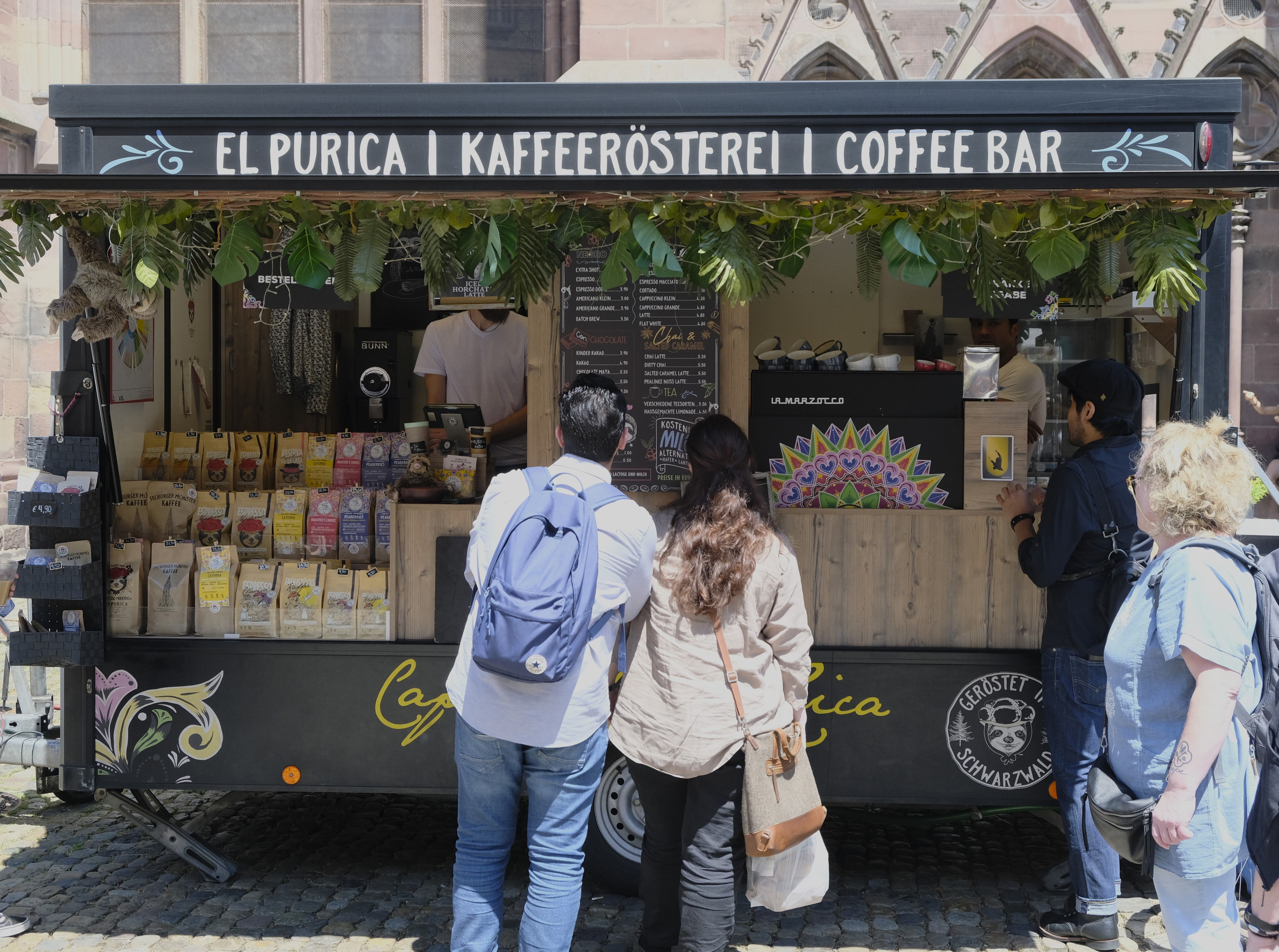 Café de spécialité costaricain : torréfaction directe et durable en tambour sur place à Pfaffenweiler - frais, de qualité et équitable sur le Münstermarkt - marché régional sur la place de la cathédrale de Freiburg.