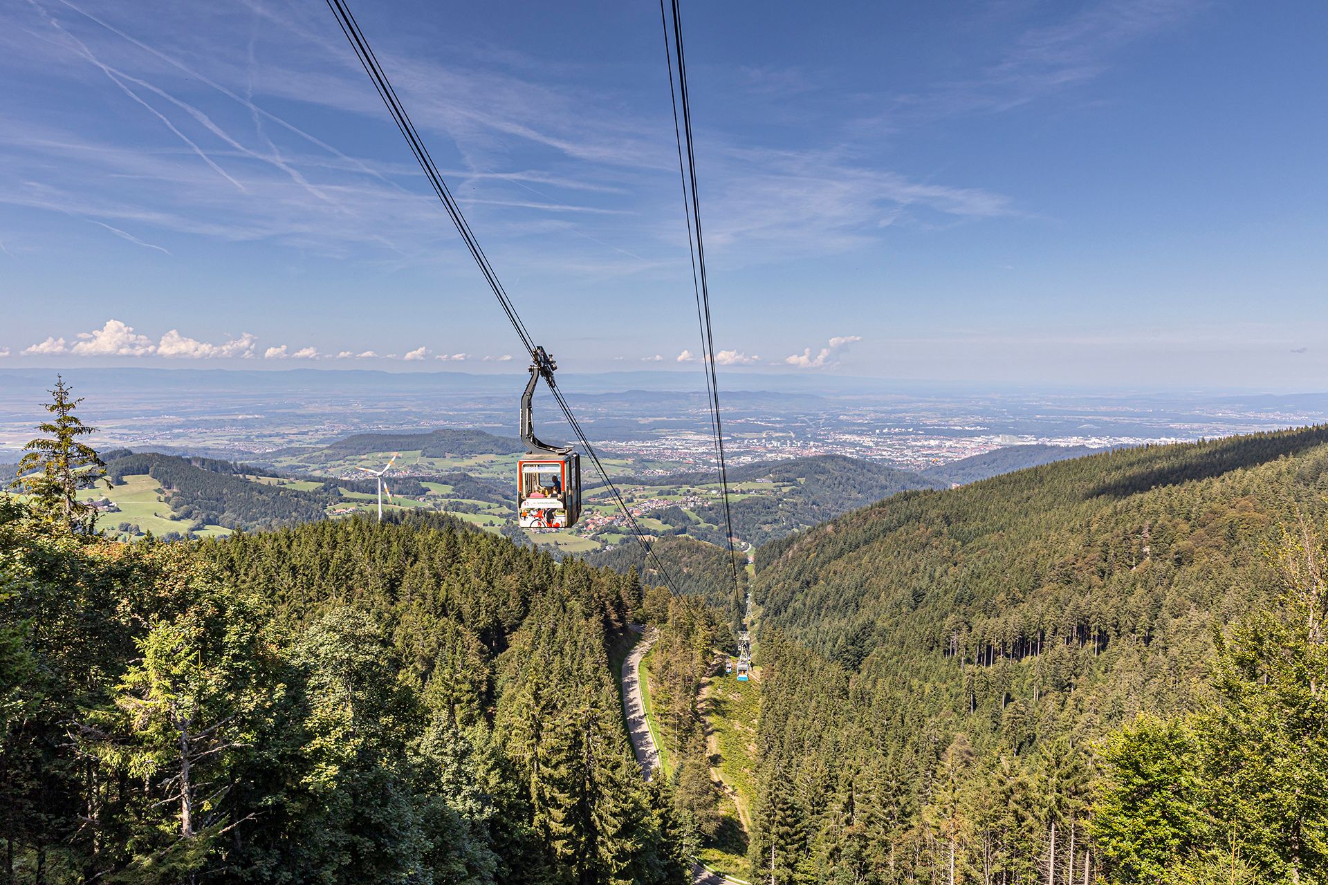Le Schauinslandbahn franchit un dénivelé de 746 mètres sur une longueur de 3600 mètres. Il a été mis en service en 1930 en tant que premier téléphérique de passagers au monde selon le principe de la circulation. Le Schauinsland culmine à 1284 m.