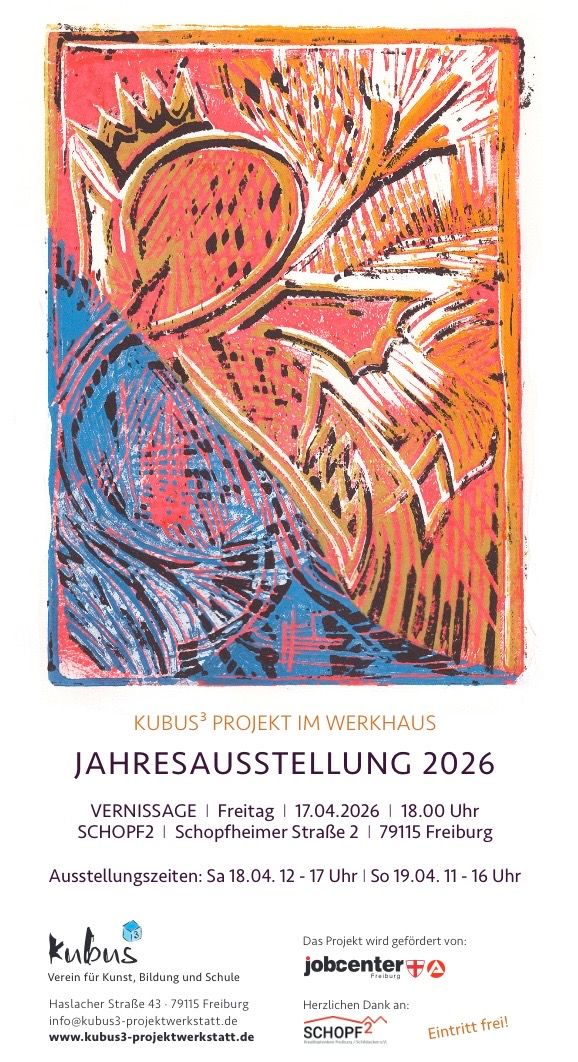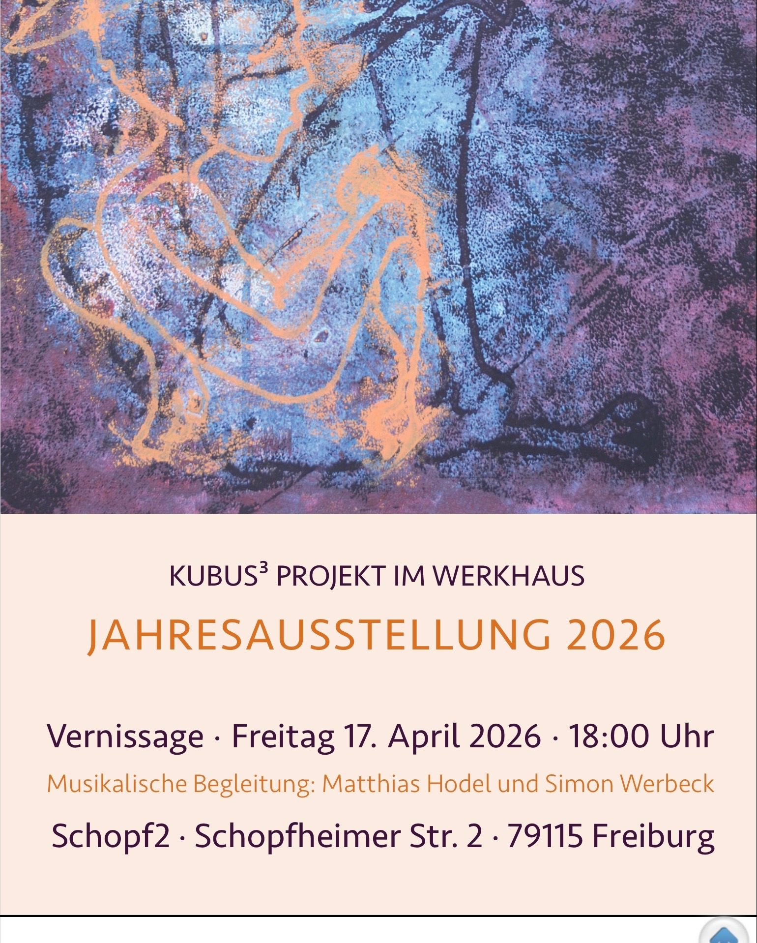 AusstellungKUBUS PROJEKT IM WERKHAUS JAHRESAUSSTELLUNG 2026KUBUS PROJEKT IM WERKHAUSJAHRESAUSSTELLUNG 2026Vernissage • Freitag 17. April 2026 • 18:00 Uhr Musikalische Begleitung: Matthias Hodel und Simon Werbeck Zur Veranstaltungswebseite