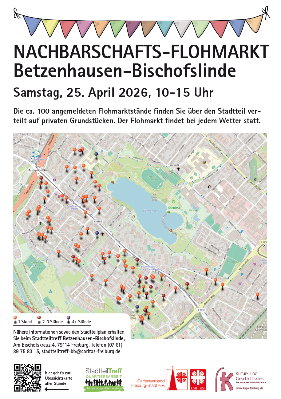 Am Samstag, 25. April findet von 10-15 Uhr der Nachbarschaftsflohmarkt Betzenhausen-Bischofslinde statt. Die zahlreichen Flohmarktstände befinden sich über den Stadtteil verteilt auf privaten Grundstücken. Eine Übersichtskarte aller Stände ist auf dem Plakat zu sehen und ist außerdem unter folgendem Link abrufbar: