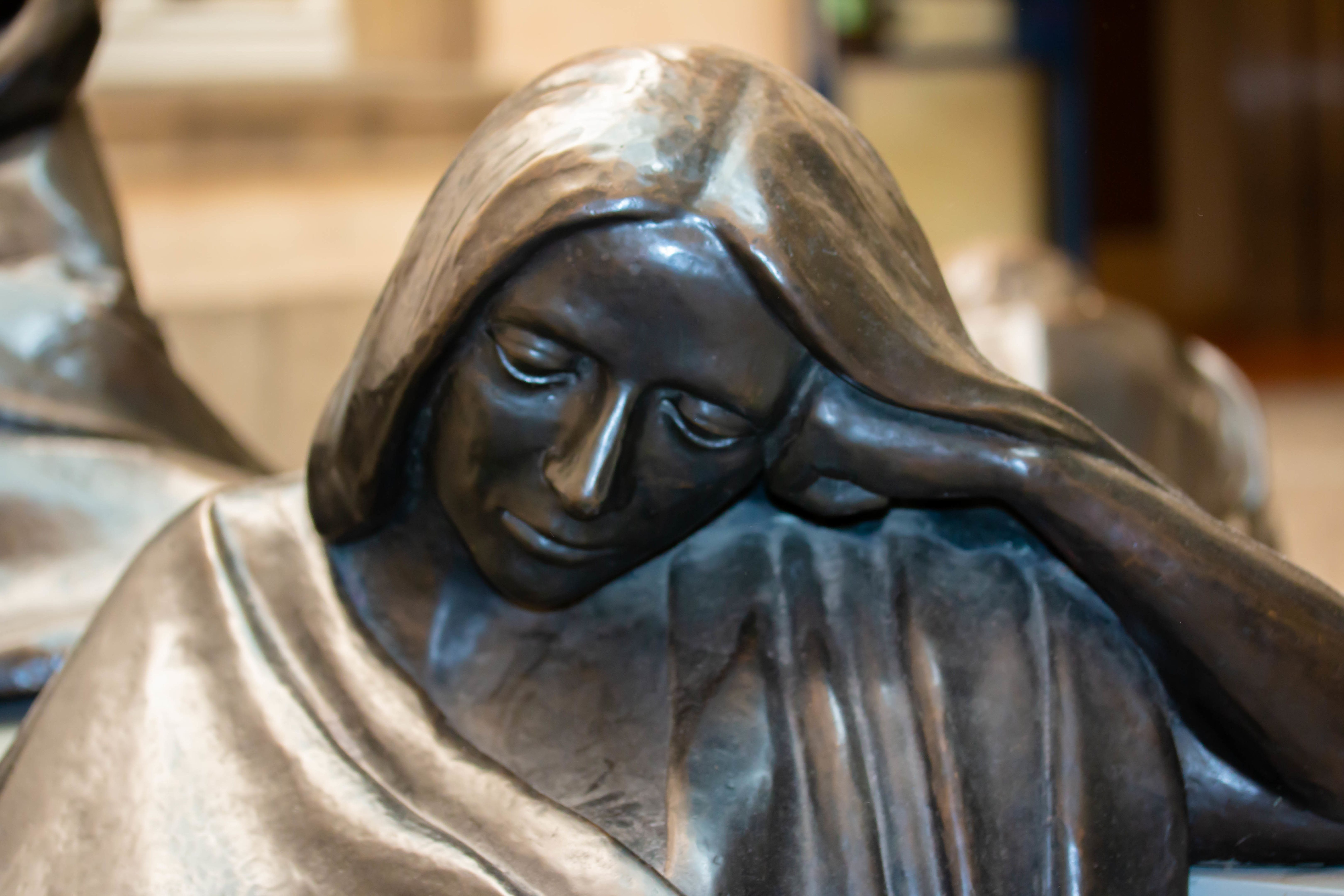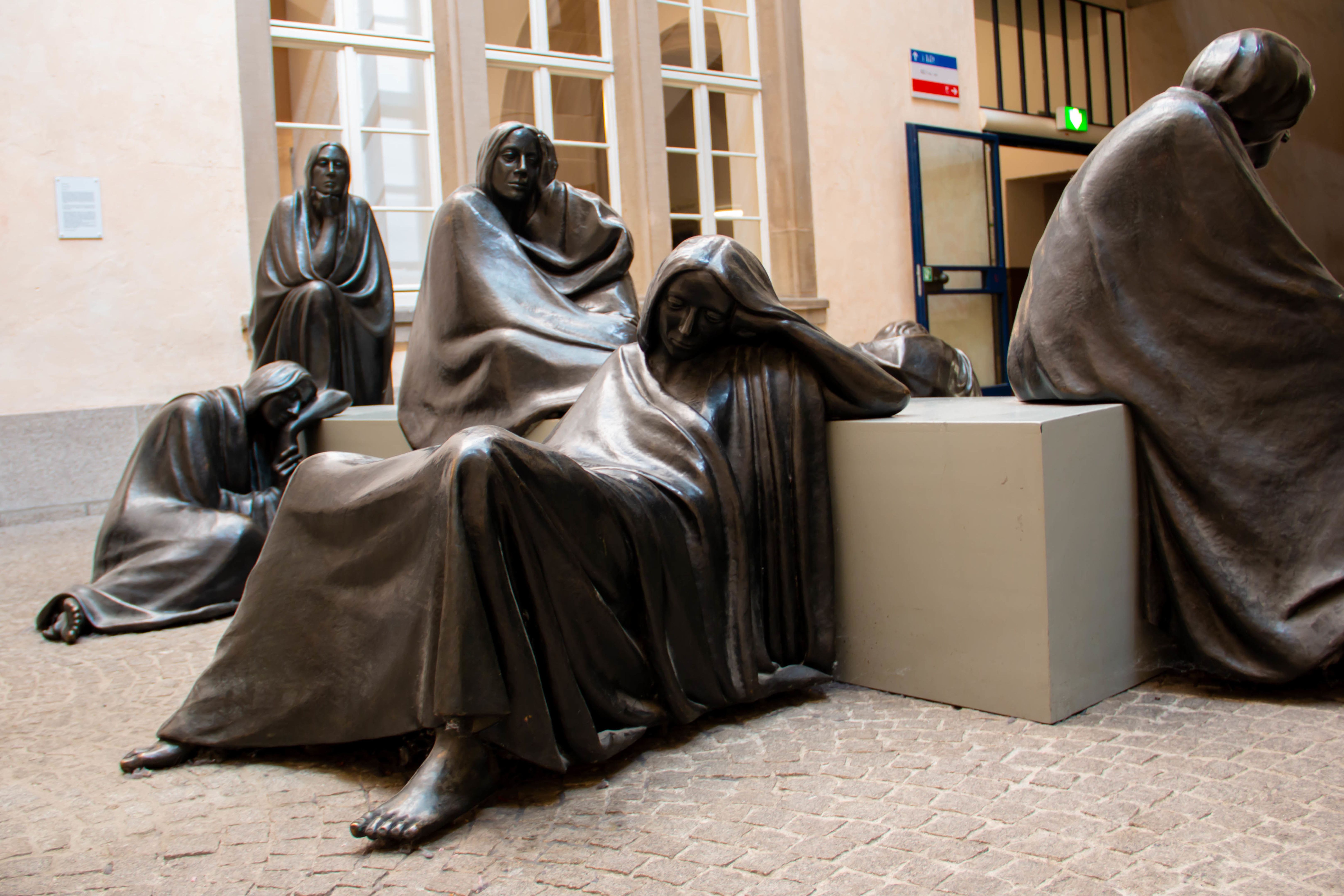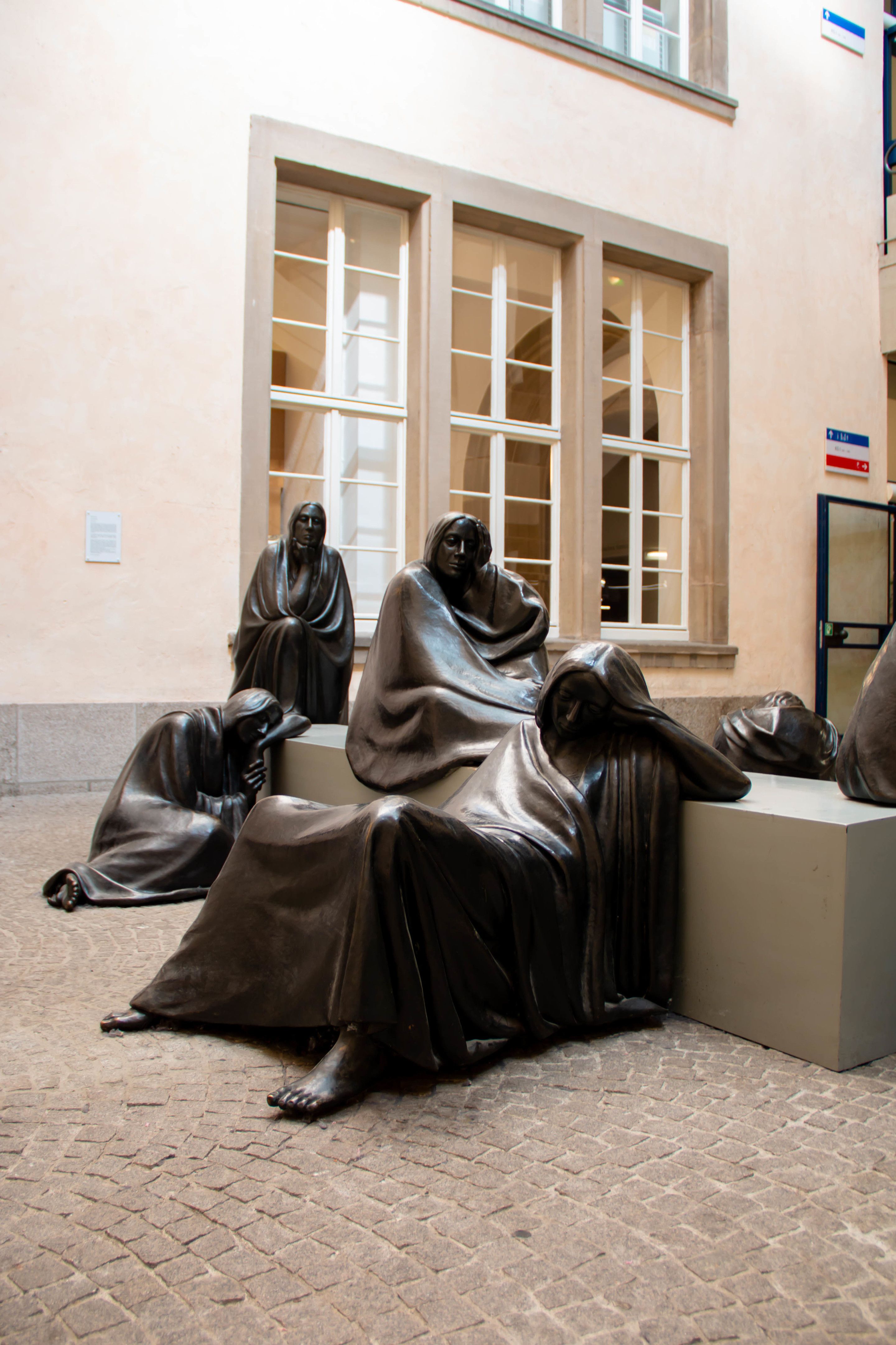 Die neun Musen von Bettina Eichin sind neun bronzene Frauenfiguren, in schwere Tücher gehüllt, im Uni-Foyer in Freiburg. Sie symbolisieren Stärke, Melancholie und das Gewicht der Geschichte.