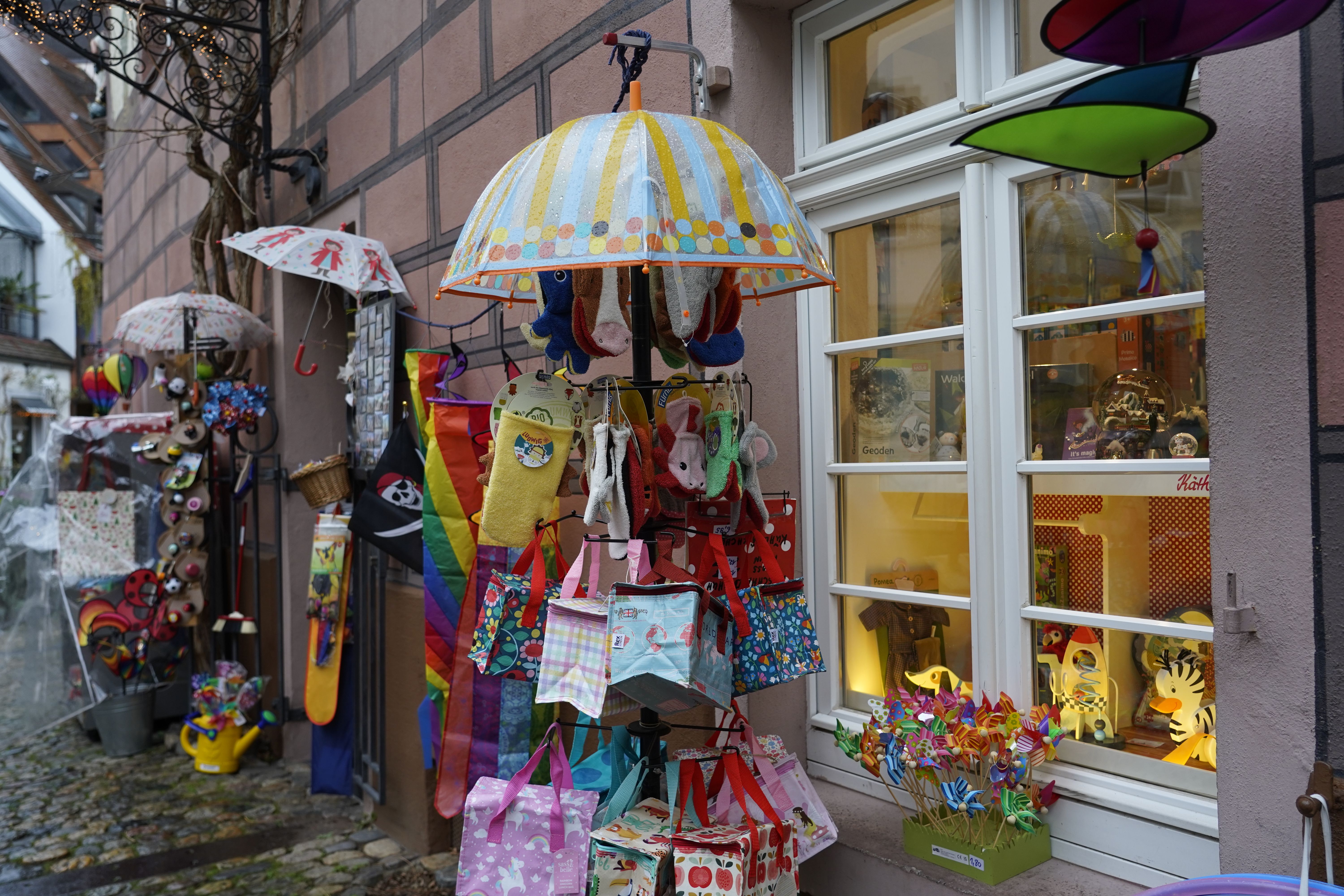 • Außenansicht eines Ladens namens Busatti in Freiburg. Ein Schaufenster mit Blumen, ein Eingang mit Textilien und eine mit Pflanzen bewachsene Fassade.