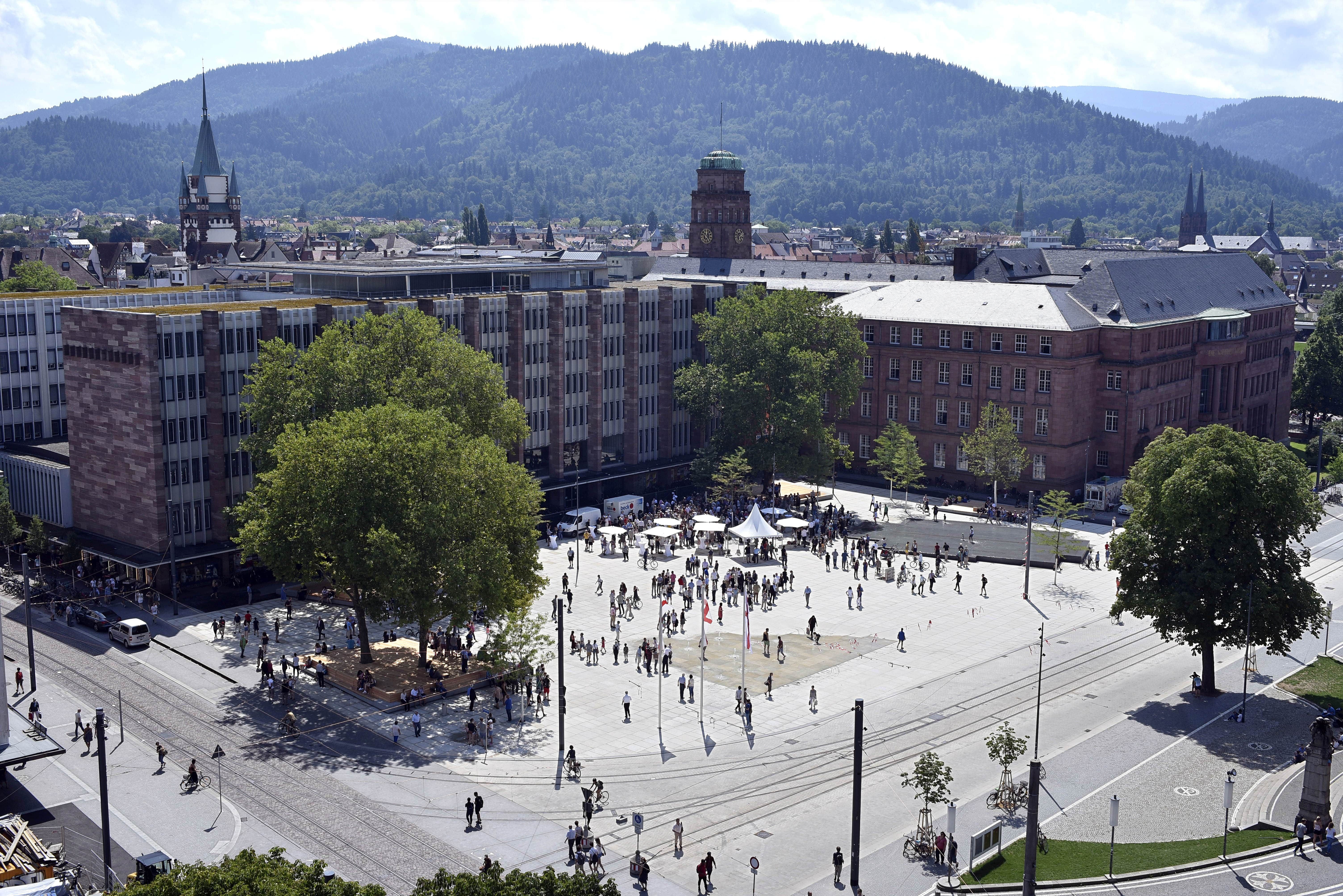 Einst stand hier die Synagoge, bis diese in der Pogromnacht 1938 niedergebrannte wurde und die grausame Geschichte der Judenverfolgung begann. Heute erinnert ein Gedenkbrunnen in Form des Grundrisses der Synagoge an vergangene Tage, gleichzeitig steht er für moderne Gestaltung und Lebensfreude. Kinder toben im erfrischenden Nass der Wasserspiele, Erwachsene sehen dem bunten Treiben zu und entspannen auf den Sitzbänken unter schattenspendenden Bäumen. Wasser bedeutet Leben und so ist der Platz der alten Synagoge neben einem Mahnmal zu einem lebendigen Platz der Begegnung und zum neuen, urbanen Mittelpunkt Freiburgs geworden.