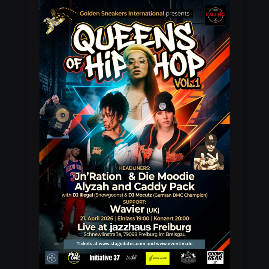 Am 21. April 2026 wird das Jazzhaus Freiburg zum Treffpunkt weiblicher Stärke, Kreativität und Verbundenheit: Golden Sneakers International und der Internationale Musik- und Kulturverein e.V. Hamburg, unterstützt von Kaliinc. London (UK), laden ein zur ersten Ausgabe von „Queens of Hip Hop“. Diese Nacht gehört den Frauen, ihren Stimmen, ihren Geschichten und ihrem Mut. Auf der Bühne vereinen sich kraftvolle Charaktere und einzigartige Klangwelten: Jn'Ration & DieMooDie – zwei Seelen, zwei Styles, getragen von den Beats von DJ Illegal (Snowgoons) Die aufstrebende Alyzah, deren Worte Herzen öffnen und Ohren aufhorchen lassen Caddy Pack, voller Energie, Haltung und Haltung – unterstützt vom deutschen DMC Champion DJ Mocutz. Seit 2018 setzt sich Golden Sneakers International dafür ein, Rapperinnen aus ganz Europa sichtbar zu machen, ihnen Räume zu öffnen und sie in einer überwiegend männlich geprägten Hip-Hop-Szene zu empowern. Als aktives Mitglied von Keychange (www.keychange.eu) setzt das Projekt ein klares Zeichen für Gleichberechtigung, Diversität und faire Chancen. „Queens of Hip Hop“ ist mehr als ein Event. Es ist ein Statement. Eine Einladung. Ein Raum für Sisterhood, Respekt und kreative Freiheit. Eine Nacht, die zeigt: Wir sind viele. Wir sind laut. Wir sind hier.