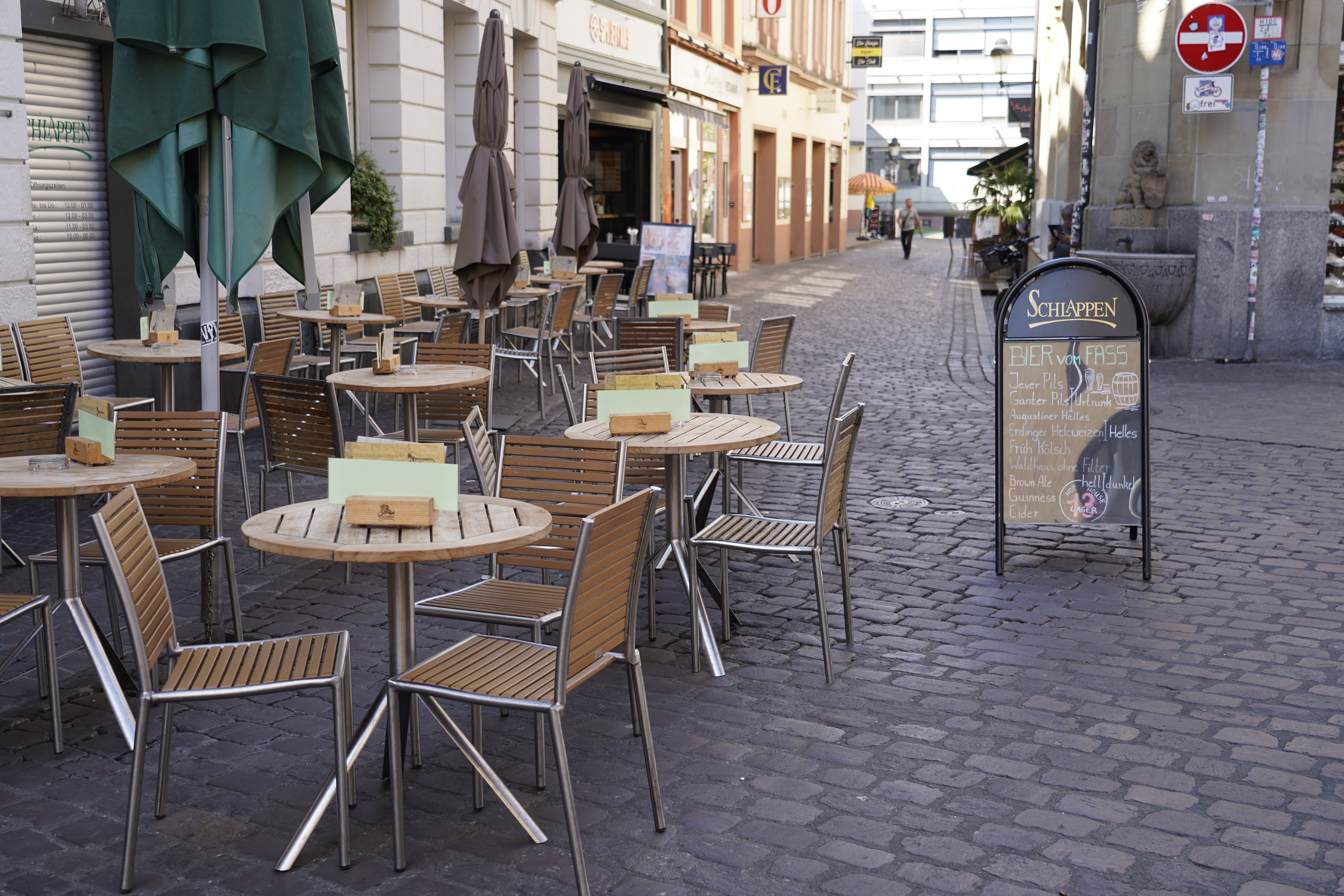 Außenansicht eines Cafés namens Schlappen in Freiburg. Vor dem Gebäude stehen Tische und Stühle auf dem Gehweg.