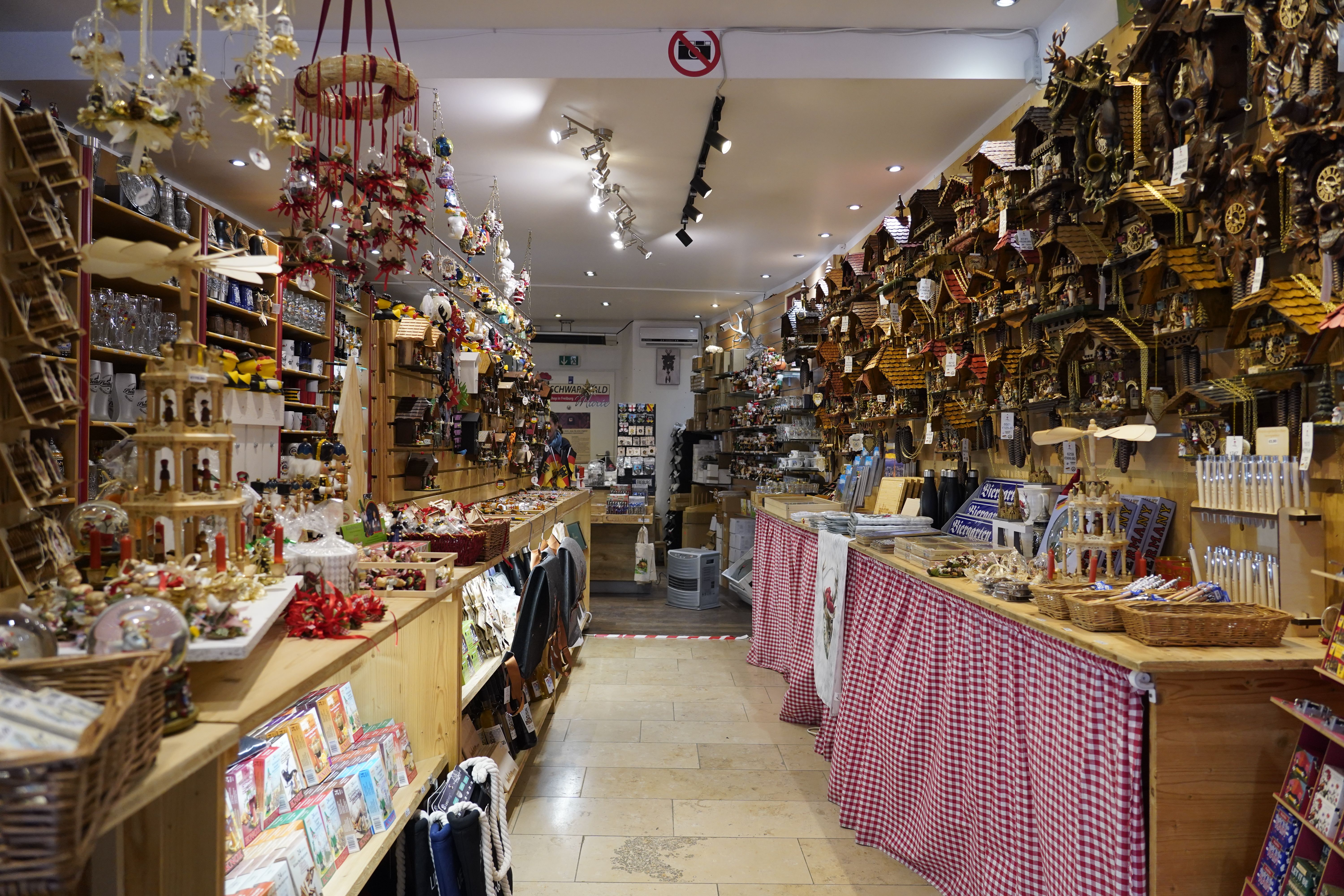 Die Schwarzwald Marie gibt es zweimal in Freiburg: direkt am Freiburger Münster und in der Rathausgasse. Hier finden Sie traditionelle und extravagante Geschenkideen und Mitbringsel aus dem Schwarzwald. Neben Tassen, Keramik, Anhängern und Reiseführern dürfen natürlich auch originales Kunsthandwerk wie die unverzichtbaren Schwarzwälder Kuckucksuhren nicht fehlen!