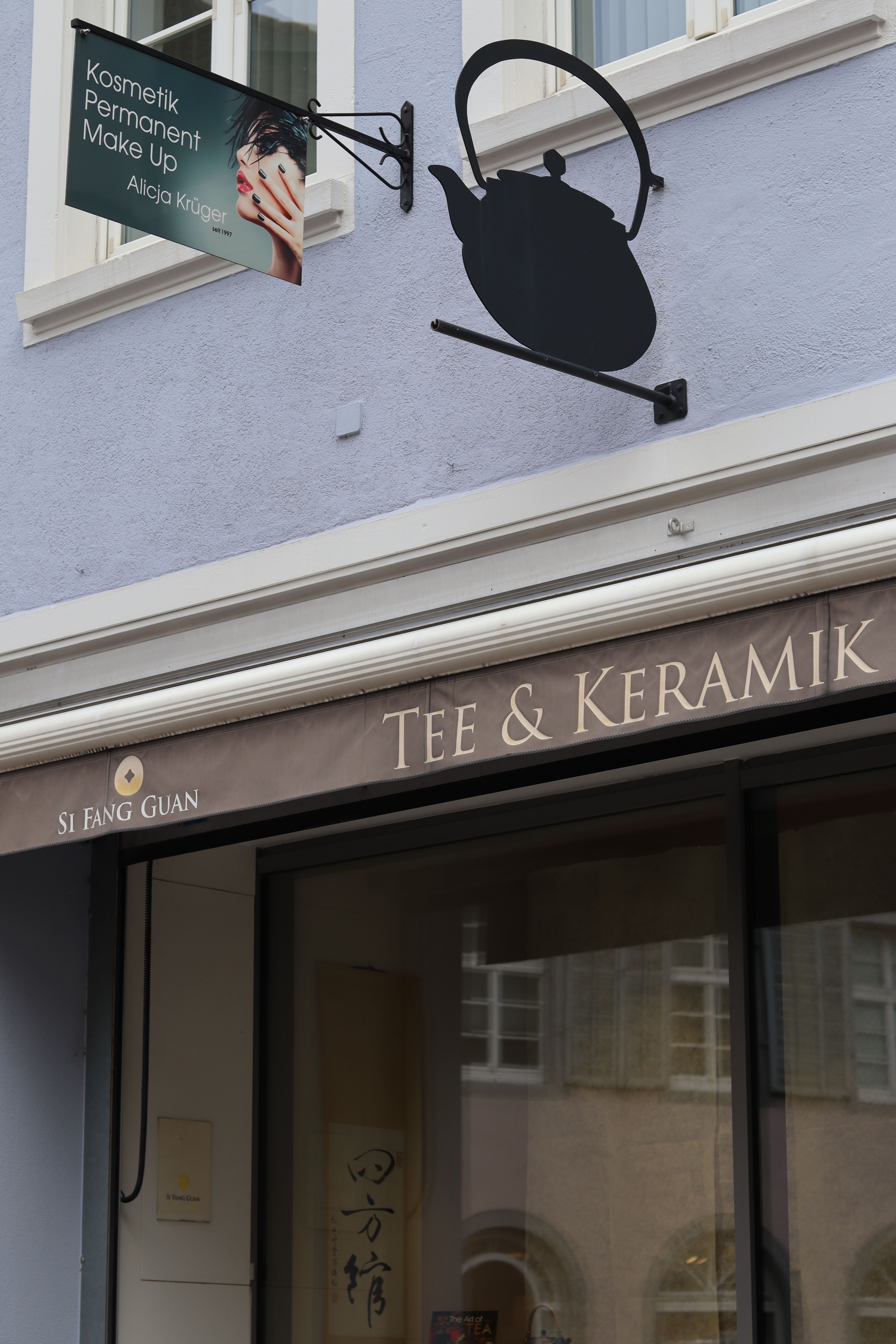 Keramiken auf einem Holztisch in einem Ausstellungsraum. An der Wand hängt eine Kalligrafie. Durch das Fenster sind Gebäude zu sehen.