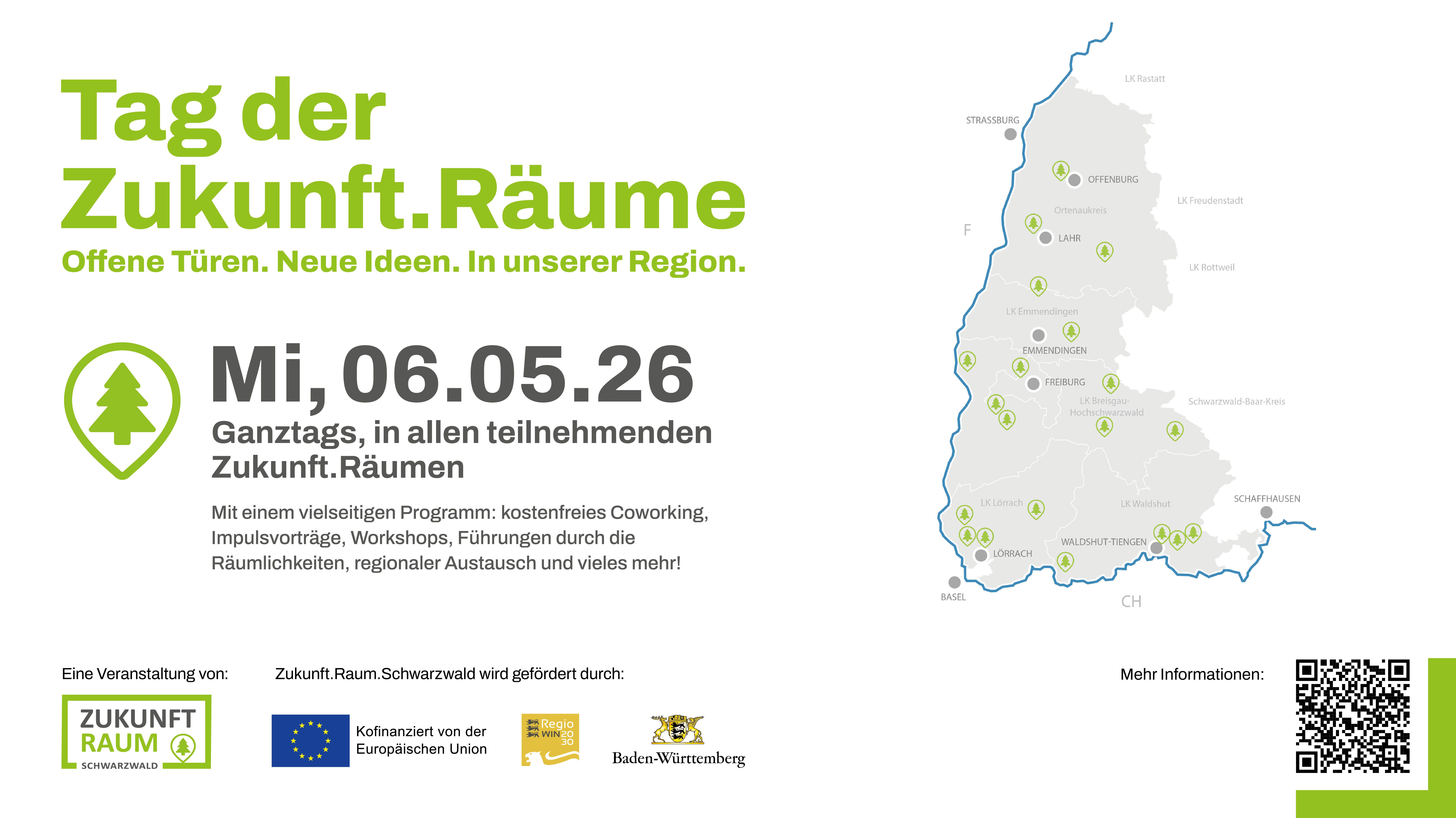 Am Mittwoch, 06. Mai 2026 laden die Zukunft.Räume im Schwarzwald zum gemeinsamen Aktionstag rund um Coworking, Innovation und neue Arbeitswelten ein. Von 9:00 bis 16:00 Uhr öffnen mehrere Zukunft.Räume in der Region ihre Türen und geben Einblicke in moderne Arbeitsumgebungen, kreative Netzwerke und regionale Innovationsorte.