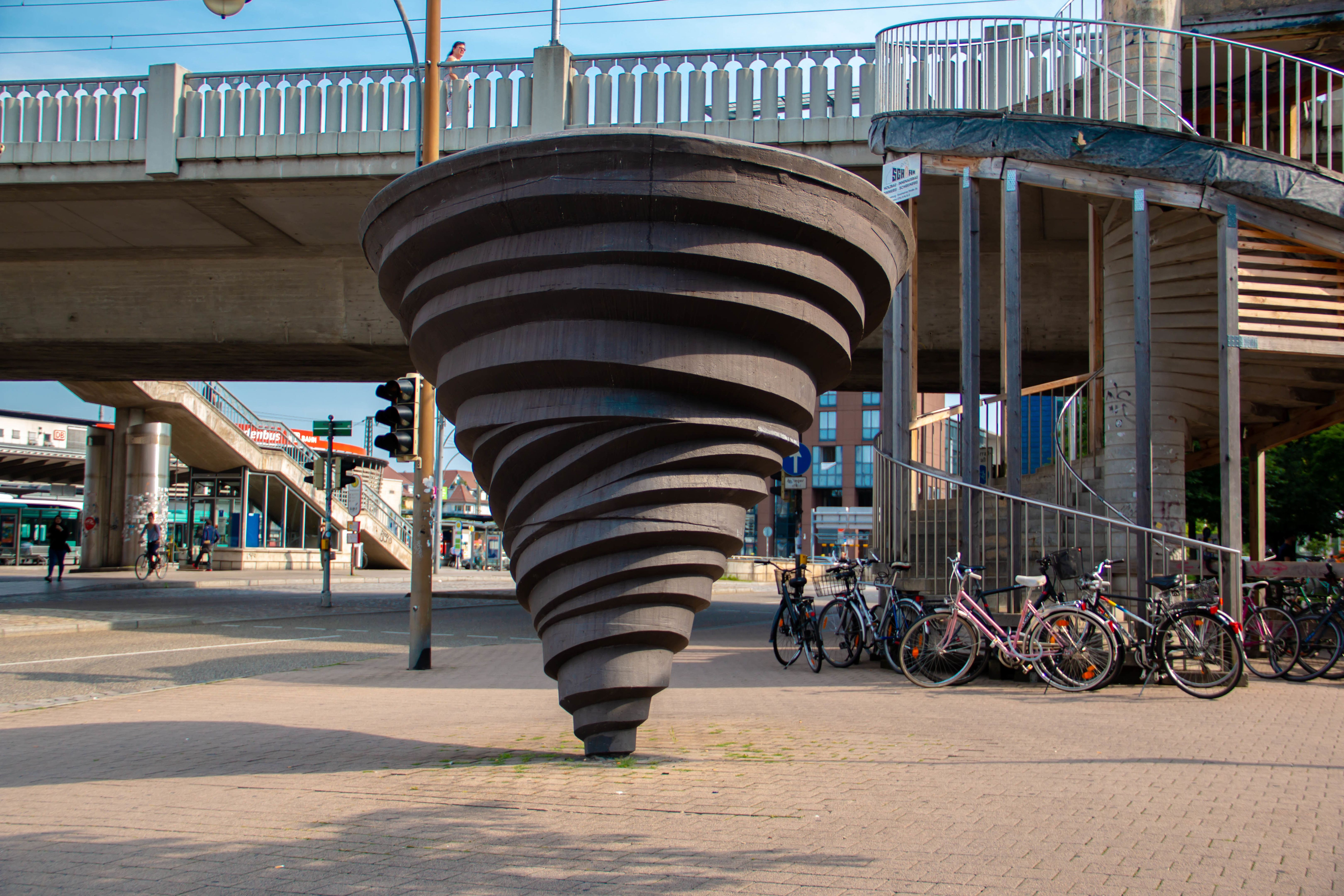 Die „Tanzenden Kegel“ von Andrea Zaumseil stehen zwischen 1996 und 2000 auf dem Konrad-Adenauer-Platz vor dem Konzerthaus Freiburg. Vier tonnenschwere Gusseisen-Kegel, mit Neigungswinkeln von 60°, 70°, 75° und 80°, wirken wie tanzende Kreisel – eine ästhetische Verbindung aus Rhythmus, Bewegung und musikalischer Energie. Mit einer Wandstärke von nur etwa 2,5 cm sind sie innen hohl und auf Betonfundamenten montiert. Regen wird über spezielle Abläufe abgeführt, damit sie stabil bleiben visit.freiburg.de. Zehn Kunststudierende bereiteten die Plätze der Kegel mit Modellen im Maßstab 1:12. Das Ensemble bringt Bewegung in den öffentlichen Raum und setzt einen starken Kontrapunkt zur vertikal strukturierten Fassade des Konzerthauses – ein schwebendes Arrangement, das Musik sichtbar macht und Besucher:innen zur Auseinandersetzung einlädt.